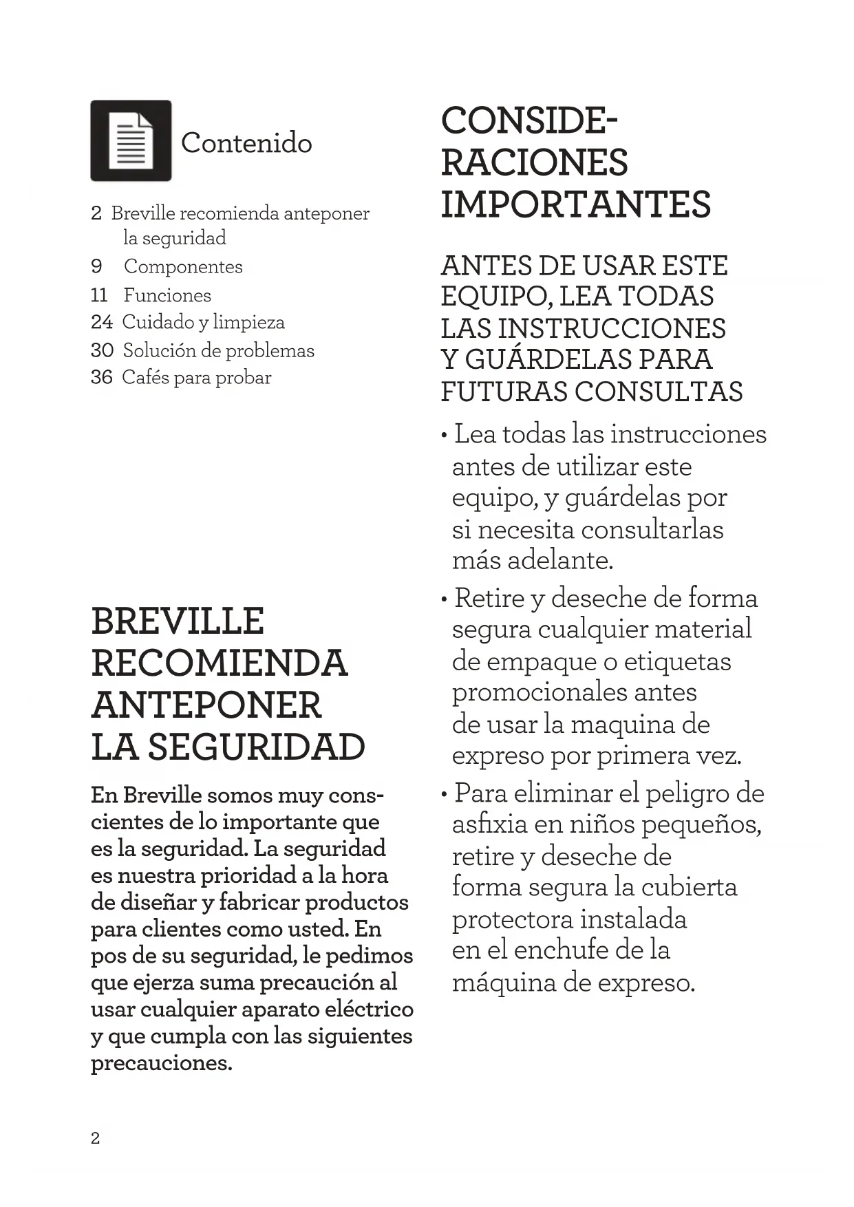 - Para eliminar el peligro de asfixia en niños pequeños, retire y deseche de forma segura la cubierta protectora instalada en elenchufe de la máquina de expreso. Contenido BREVILLE RECOMIENDA ANTEPONER LASEGURIDAD En Breville somos muy cons- cientes de lo importante que esla seguridad. La seguridad es nuestra prioridad a la hora de diseñar y fabricar productos para clientes como usted. En pos de su seguridad, le pedimos que ejerza suma precaución al usar cualquier aparato eléctrico y que cumpla con las siguientes precauciones. 2 Breville recomienda anteponer laseguridad 9 Componentes 11 Funciones 24 Cuidado ylimpieza 30 Solución de problemas 36 Cafés para probar3 ES-MX