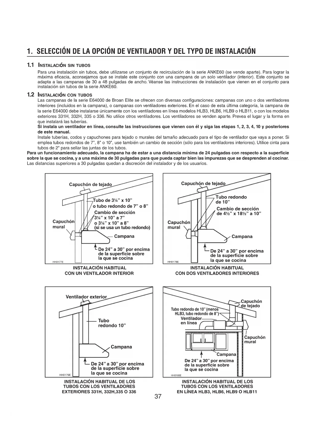 campanas de la serie E64E de Broan Elite deben instalarse únicamente con un ventilador exterior de Broan modelo 331H, 332H, 335 o 336, o con un ventilador en línea de Broan modelo HLB3, HLB6, HLB9 o HLB11. No debe utilizar otros ventiladores. Los ventiladores exteriores o en línea se venden aparte.