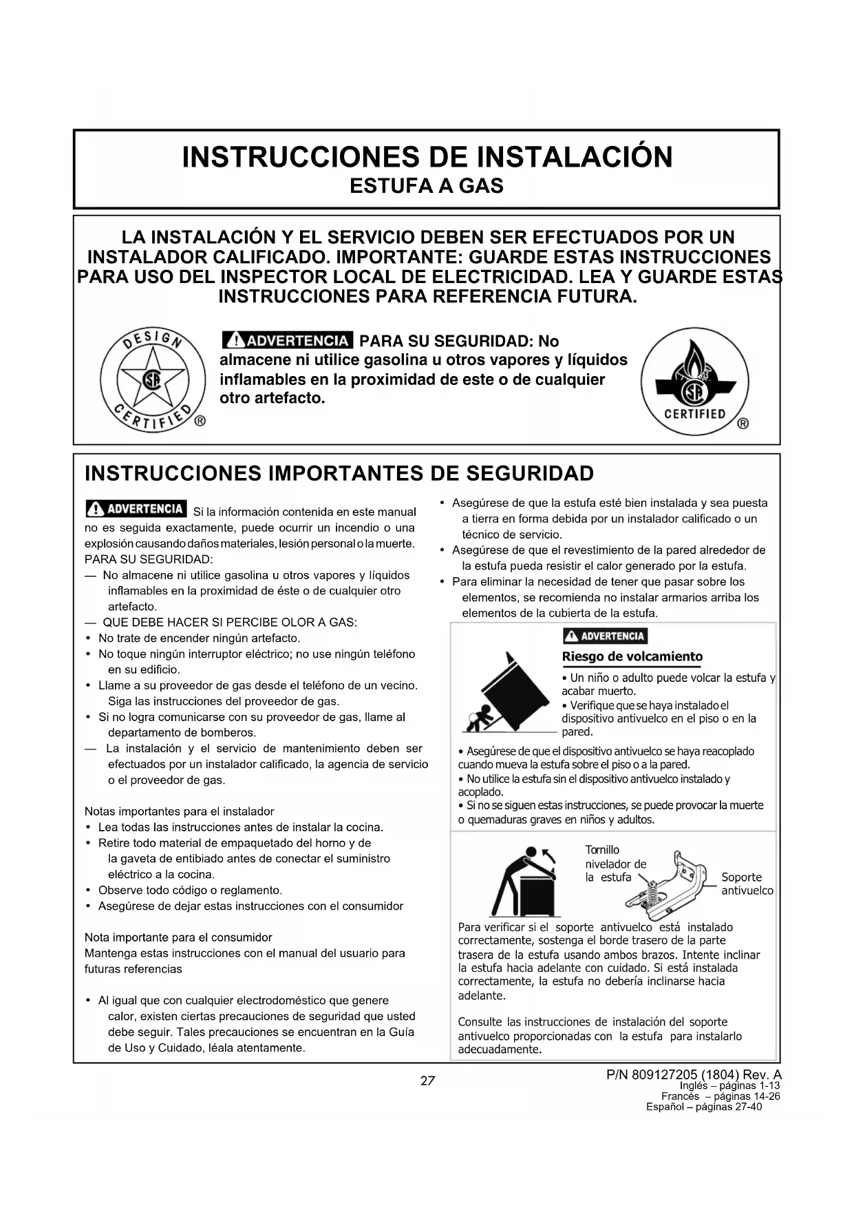 Si la información contenida en este manual no es seguida exactamente, puede ocurrir un incendio o una explosión causando daños materiales, lesión personal o la muerte.PARA SU SEGURIDAD:— No almacene ni utilice gasolina u otros vapores y líquidos inamables en la proximidad de éste o de cualquier otro artefacto.— QUE DEBE HACER SI PERCIBE OLOR A GAS:• No trate de encender ningún artefacto.• No toque ningún interruptor eléctrico; no use ningún teléfono en su edicio.• Llame a su proveedor de gas desde el teléfono de un vecino. Siga las instrucciones del proveedor de gas.• Si no logra comunicarse con su proveedor de gas, llame al departamento de bomberos.— La instalación y el servicio de mantenimiento deben ser efectuados por un instalador calicado, la agencia de servicio o el proveedor de gas.Notas importantes para el instalador• Lea todas las instrucciones antes de instalar la cocina.• Retire todo material de empaquetado del horno y de la gaveta de entibiado antes de conectar el suministro eléctrico a la cocina.• Observe todo código o reglamento.• Asegúrese de dejar estas instrucciones con el consumidorNota importante para el consumidorMantenga estas instrucciones con el manual del usuario para futuras referencias• Al igual que con cualquier electrodoméstico que genere calor, existen ciertas precauciones de seguridad que usted debe seguir. Tales precauciones se encuentran en la Guía de Uso y Cuidado, léala atentamente. P/N 809127205 (1804) Rev. AInglés – páginas 1-13Francés – páginas 14-26 Español – páginas 27-40• Asegúrese de que la estufa esté bien instalada y sea puesta a tierra en forma debida por un instalador calicado o un técnico de servicio.• Asegúrese de que el revestimiento de la pared alrededor de la estufa pueda resistir el calor generado por la estufa.• Para eliminar la necesidad de tener que pasar sobre los elementos, se recomienda no instalar armarios arriba los elementos de la cubierta de la estufa. PARA SU SEGURIDAD: No almacene ni utilice gasolina u otros vapores y líquidos inflamables en la proximidad de este o de cualquier otro artefacto. Riesgo de volcamiento• Un niño o adulto puede volcar la estufa y acabar muerto.