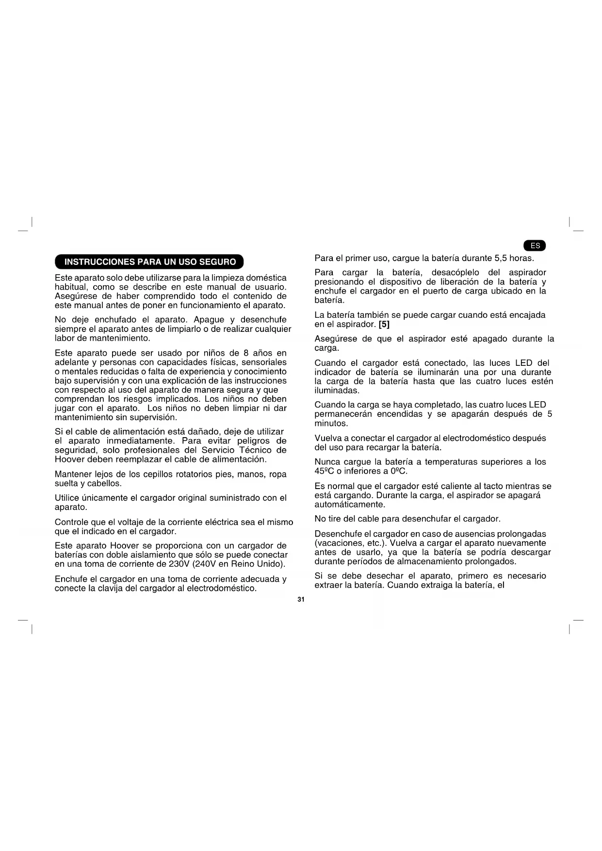 Este aparato solo debe utilizarse para la limpieza doméstica habitual, como se describe en este manual de usuario. Asegúrese de haber comprendido todo el contenido de este manual antes de poner en funcionamiento el aparato. No deje enchufado el aparato. Apague y desenchufe siempre el aparato antes de limpiarlo o de realizar cualquier labor de mantenimiento. Este aparato puede ser usado por niños de 8 años en adelante y personas con capacidades físicas, sensoriales o mentales reducidas o falta de experiencia y conocimiento bajo supervisión y con una explicación de las instrucciones con respecto al uso del aparato de manera segura y que comprendan los riesgos implicados. Los niños no deben jugar con el aparato. Los niños no deben limpiar ni dar mantenimiento sin supervisión. Si el cable de alimentación está dañado, deje de utilizar el aparato inmediatamente. Para evitar peligros de seguridad, solo profesionales del Servicio Técnico de Hoover deben reemplazar el cable de alimentación. Mantener lejos de los cepillos rotatorios pies, manos, ropa suelta y cabellos. Utilice únicamente el cargador original suministrado con el aparato. Controle que el voltaje de la corriente eléctrica sea el mismo que el indicado en el cargador. Este aparato Hoover se proporciona con un cargador de baterías con doble aislamiento que sólo se puede conectar en una toma de corriente de 230V (240V en Reino Unido). Enchufe el cargador en una toma de corriente adecuada y conecte la clavija del cargador al electrodoméstico. Para el primer uso, cargue la batería durante 5,5 horas. Para cargar la batería, desacóplelo del aspirador presionando el dispositivo de liberación de la batería y enchufe el cargador en el puerto de carga ubicado en la batería. La batería también se puede cargar cuando está encajada en el aspirador. [5] Asegúrese de que el aspirador esté apagado durante la carga. Cuando el cargador está conectado, las luces LED del indicador de batería se iluminarán una por una durante la carga de la batería hasta que las cuatro luces estén iluminadas. Cuando la carga se haya completado, las cuatro luces LED permanecerán encendidas y se apagarán después de 5 minutos. Vuelva a conectar el cargador al electrodoméstico después del uso para recargar la batería. Nunca cargue la batería a temperaturas superiores a los 45ºC o inferiores a 0ºC. Es normal que el cargador esté caliente al tacto mientras se está cargando. Durante la carga, el aspirador se apagará automáticamente. No tire del cable para desenchufar el cargador. Desenchufe el cargador en caso de ausencias prolongadas (vacaciones, etc.). Vuelva a cargar el aparato nuevamente antes de usarlo, ya que la batería se podría descargar durante períodos de almacenamiento prolongados. Si se debe desechar el aparato, primero es necesario extraer la batería. Cuando extraiga la batería, el ES32 electrodoméstico debe estar desconectado de la red eléctrica. Elimine la batería de manera segura. Haga funcionar el electrodoméstico hasta que se detenga debido a que la batería está totalmente descargada. Las baterías usadas deben llevarse a un punto de reciclaje y no deben desecharse con los residuos domésticos. Para quitar la batería, contacte con el Servicio Técnico de Hoover o siga las presentes instrucciones. IMPORTANTE: Descargue siempre las baterías completamente antes de desecharlas y asegúrese de que el cargador está desenchufado. Haga funcionar el aspirador hasta que las baterías estén completamente descargadas. Quite el conector jack del cargador del electrodoméstico. Pulse el botón de liberación de la batería para expulsar la batería. [5] Saque lentamente la batería de la ranura. [5] NOTA: Si llega a experimentar problemas al desmontar el aspirador o para obtener información más detallada sobre el tratamiento, la recuperación y el reciclaje de este electrodoméstico, contacte con su Ayuntamiento o con el servicio de recogida de residuos domésticos de su zona. No sustituya las baterías por baterías no recargables. Utilizar únicamente accesorios, consumibles o recambios recomendados o suministrados por HOOVER. Electricidad estática: Algunas alfombras pueden provocar una pequeña acumulación de electricidad estática. Las descargas estáticas no son peligrosas para la salud. No utilice el aparato al aire libre, en supercies húmedas o para recoger líquidos. No aspire objetos duros o alados, cerillas, cenizas calientes, colillas de cigarrillo u objetos similares. No rocíe, ni aspire líquidos inamables, aerosoles para limpiar o sus vapores. No pase por encima del cable de alimentación cuando utilice el aparato ni lo desenchufe tirando del cable. No siga utilizando el aparato si parece tener algún defecto. Servicio Técnico HOOVER: Para garantizar el funcionamiento seguro y ecaz del aparato, recomendamos que las tareas de mantenimiento y reparación sean realizadas exclusivamente por profesionales autorizados del Servicio Técnico de Hoover. No pise el cable, ni lo enrolle en los brazos ni piernas al utilizar el aparato. No utilice el aparato en personas ni animales. No sitúe el aparato por encima de usted cuando esté limpiando las escaleras. El Medio Ambiente: El símbolo que puede verse en el producto indica que este no puede tratarse como residuo doméstico. En su lugar, se debe entregar en un punto de recogida de electrodomésticos para el reciclaje de equipos eléctricos y electrónicos. La eliminación debe llevarse a cabo según los reglamentos medioambientales locales sobre eliminación de residuos. Para información más detallada sobre el tratamiento, la recuperación y el reciclaje de este aparato, ponte en contacto con tu Ayuntamiento, el servicio de recogida de residuos domésticos o con el establecimiento donde hayas comprado el producto. Este electrodoméstico cumple con las Directivas Europeas 2014/35/UE, 2014/30/ UE y 2011/65/UE. CANDY HOOVER GROUP S.r.l. Via Privata Ede