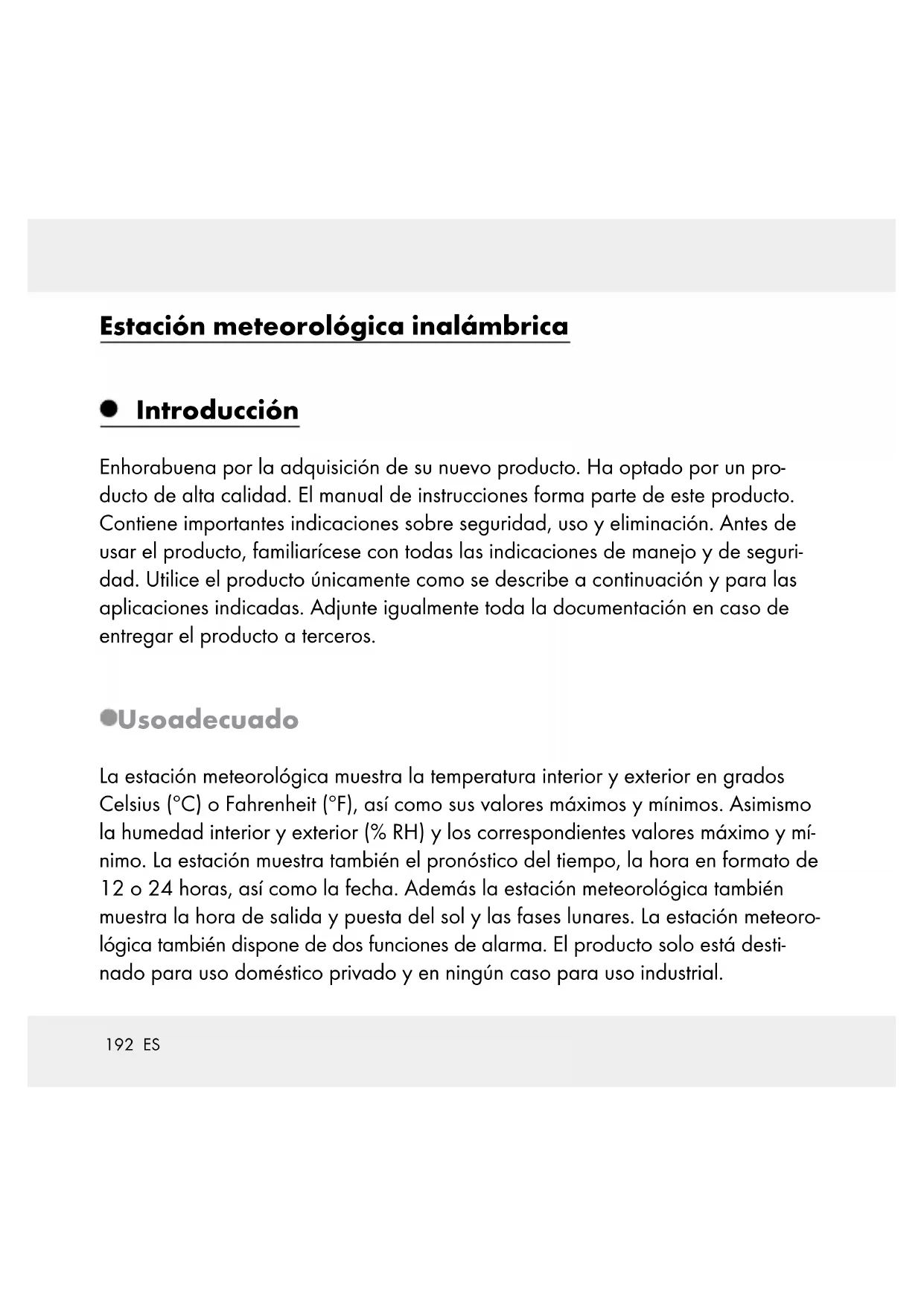 Volumen de suministro 1 estación meteorológica 1 sensor exterior 3 pilas, AA, 1,5 V (ya instalada) 2 pilas, AA, 1,5 V (ya instalada) 1 manual de instrucciones Seguridad Lea todas las advertencias e indicaciones de seguridad. El incumplimiento de las advertencias e indicaciones de seguridad puede dar lugar a descargas eléctricas, incendios y / o lesiones graves.196 ES ¡GUARDAR TODAS LAS ADVERTENCIAS E INDICACIONES DE SEGURIDAD PARA FUTURAS CONSULTAS! Indicaciones generales de seguridad Los niños subestiman a menudo los peligros. Manténgalos siempre alejados del producto. Este producto puede ser utilizado por niños mayores de 8 años, así como por personas con capacidades físicas, sensoriales o mentales reducidas o que cuenten con poca experiencia y/o falta de conocimientos, siempre y cuando se les haya enseñado cómo utilizar el producto de forma segura y hayan com- prendido los peligros que pueden resultar de un mal uso del mismo. No per- mita que los niños jueguen con el producto. La limpieza y el mantenimiento nunca deben llevarse a cabo por niños sin la vigilancia de un adulto. No ponga el producto en funcionamiento si está dañado. Indicaciones de seguridad sobre pilas ¡PELIGRO DE MUERTE! Las pilas podrían ser ingeridas, lo cual podría resultar mortal. Si se ingiriese una pila, habrá que solicitar asistencia médica inmediatamente.197 ES Retire las pilas del producto si no va a utilizarlo durante un periodo de tiempo prolongado. ¡CUIDADO! ¡PELIGRO DE EXPLOSIÓN! ¡No recargue nunca las pilas! ¡Cuando coloque las pilas, observe la polaridad correcta! Ésta se indica en el compartimento de las pilas. En caso necesario, limpie los contactos de la pila y del aparato antes de introducir las pilas. Retire inmediatamente las pilas gastadas del producto. ¡Existe un riesgo elevado de sulfatación! ¡Las pilas no deben desecharse junto con la basura doméstica! ¡Todos los usuarios están obligados por ley a desechar las pilas de forma adecuada! Mantenga las pilas lejos del alcance de los niños. No arroje las pilas al fuego. No cortocircuite las pilas y no intente desarmarlas. Reemplace todas las pilas a la vez. Utilice únicamente pilas del mismo tipo. ¡En caso de que se haya derramado el líquido de las pilas dentro del producto, sáquelas inmediatamente para evitar daños en el mismo! Evite el contacto con la piel, ojos y mucosas. Si entra en contacto con el ácido de las pilas, lave la parte afectada con agua abundante y / o procure atención médica.198 ES Antes de la puesta en servicio Colocación de los dispositivos Coloque primero las pilas en el sensor externo y después en la estación meteorológica. ¡PRECAUCIÓN! Al elegir un lugar donde colocar los dispositivos, asegúrese de que éstos no están expuestos directamente a radiaciones solares, vibraciones, polvo, calor, frío o humedad. No sitúe los aparatos cerca de fuentes de calor (p. ej. radiadores). De hacerlo podrían sufrir daños. Utilice un protector indicado si coloca los dispositivos sobre superficies delica- das o de valor. En caso contrario, podrían dañarse. Asegúrese de que los aparatos adyacentes no utilicen la misma frecuencia de 433 MHz. Estos aparatos pueden alterar la comunicación inalámbrica. No coloque los aparatos cerca o encima de placas de metal. La transmisión inalámbrica entre los dispositivos podría verse alterada. No instale los dispositivos en edificios de hormigón armado, p. ej. aeropuertos, rascacielos, fábricas o sótanos. La transmisión de radiofrecuencia entre los dispositivos podría verse fuertemente reducida.199 ES Puesta en marcha del sensor exterior Retire la tapa del compartimento de las pilas en la parte trasera del sensor exterior. Retire la cinta de seguridad de la pila. El sensor exterior ahora está listo para funcionar y el LED de control