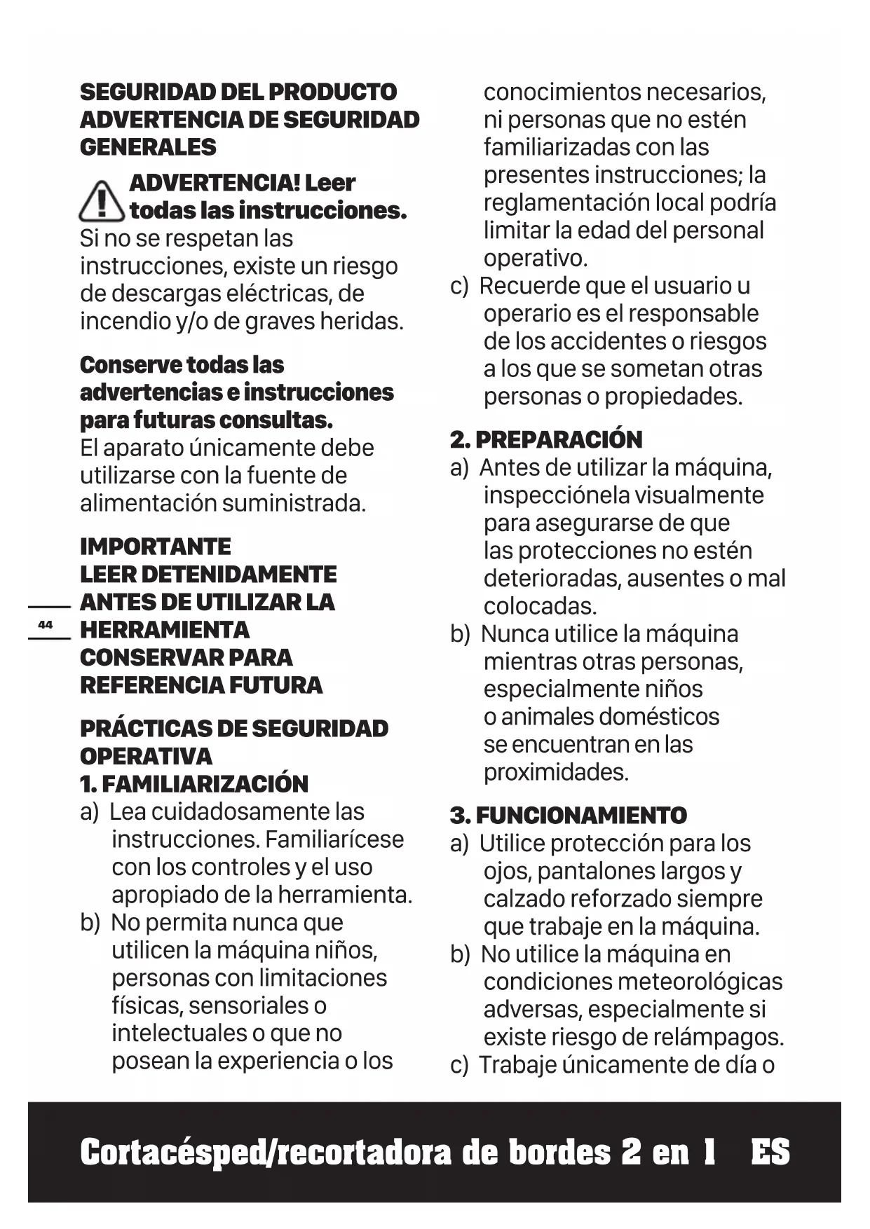 a) Utilice protección para los ojos, pantalones largos y calzado reforzado siempre que trabaje en la máquina. b) No utilice la máquina en condiciones meteorológicas adversas, especialmente si existe riesgo de relámpagos. c) Trabaje únicamente de día oCortacésped/recortadora de bordes 2 en 1