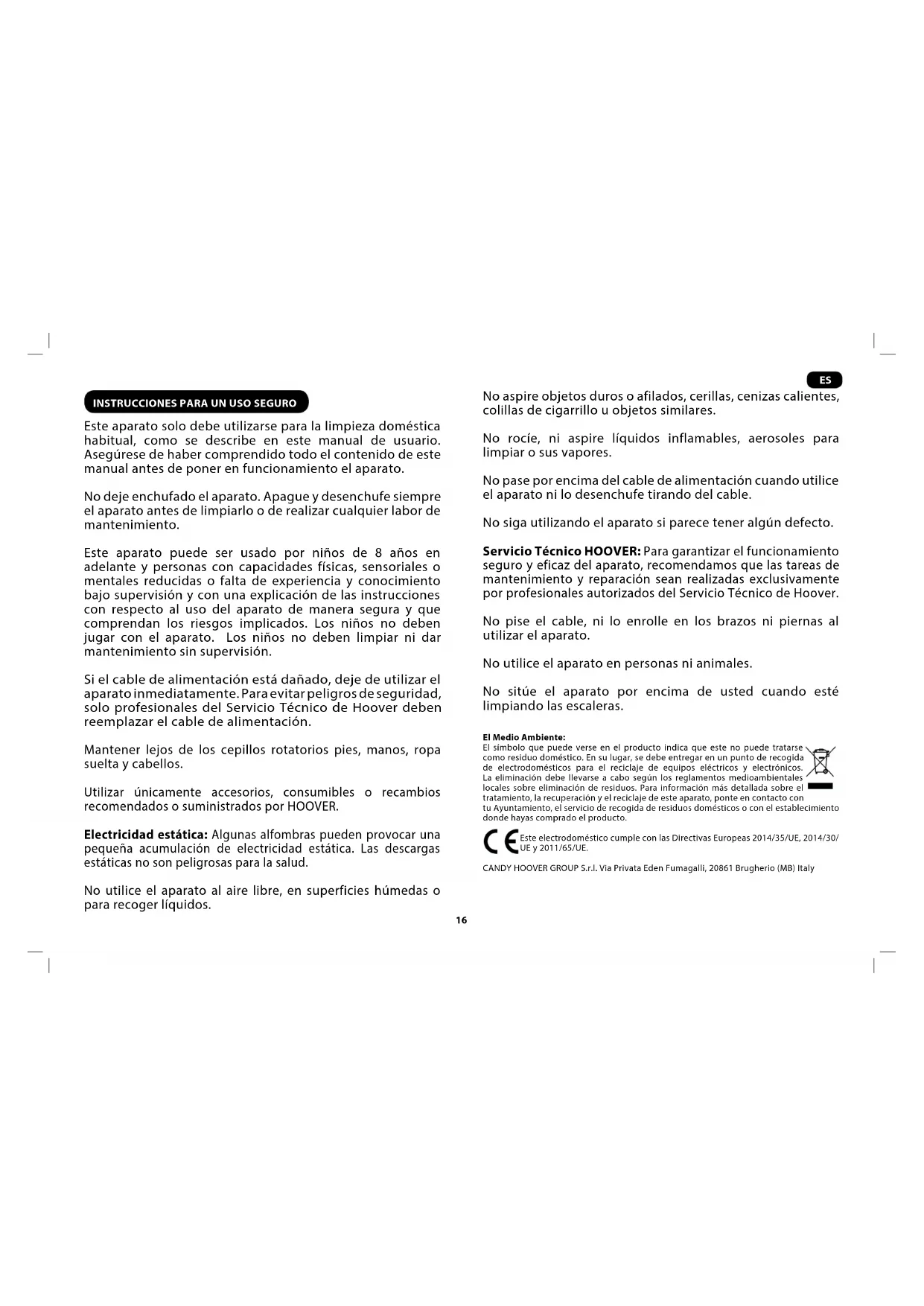 Este aparato solo debe utilizarse para la limpieza doméstica habitual, como se describe en este manual de usuario. Asegúrese de haber comprendido todo el contenido de este manual antes de poner en funcionamiento el aparato. No deje enchufado el aparato. Apague y desenchufe siempre el aparato antes de limpiarlo o de realizar cualquier labor de mantenimiento. Este aparato puede ser usado por niños de 8 años en adelante y personas con capacidades físicas, sensoriales o mentales reducidas o falta de experiencia y conocimiento bajo supervisión y con una explicación de las instrucciones con respecto al uso del aparato de manera segura y que comprendan los riesgos implicados. Los niños no deben jugar con el aparato. Los niños no deben limpiar ni dar mantenimiento sin supervisión. Si el cable de alimentación está dañado, deje de utilizar el aparato inmediatamente. Para evitar peligros de seguridad, solo profesionales del Servicio Técnico de Hoover deben reemplazar el cable de alimentación. Mantener lejos de los cepillos rotatorios pies, manos, ropa suelta y cabellos. Utilizar únicamente accesorios, consumibles o recambios recomendados o suministrados por HOOVER. Electricidad estática: Algunas alfombras pueden provocar una pequeña acumulación de electricidad estática. Las descargas estáticas no son peligrosas para la salud. No utilice el aparato al aire libre, en superficies húmedas o para recoger líquidos. No aspire objetos duros o afilados, cerillas, cenizas calientes, colillas de cigarrillo u objetos similares. No rocíe, ni aspire líquidos inflamables, aerosoles para limpiar o sus vapores. No pase por encima del cable de alimentación cuando utilice el aparato ni lo desenchufe tirando del cable. No siga utilizando el aparato si parece tener algún defecto. Servicio Técnico HOOVER: Para garantizar el funcionamiento seguro y eficaz del aparato, recomendamos que las tareas de mantenimiento y reparación sean realizadas exclusivamente por profesionales autorizados del Servicio Técnico de Hoover. No pise el cable, ni lo enrolle en los brazos ni piernas al utilizar el aparato. No utilice el aparato en personas ni animales. No sitúe el aparato por encima de usted cuando esté limpiando las escaleras. El Medio Ambiente: El símbolo que puede verse en el producto indica que este no puede tratarse como residuo doméstico. En su lugar, se debe entregar en un punto de recogida de electrodomésticos para el reciclaje de equipos eléctricos y electrónicos. La eliminación debe llevarse a cabo según los reglamentos medioambientales locales sobre eliminación de residuos. Para información más detallada sobre el tratamiento, la recuperación y el reciclaje de este aparato, ponte en contacto con tu Ayuntamiento, el servicio de recogida de residuos domésticos o con el establecimiento donde hayas comprado el producto. Este electrodoméstico cumple con las Directivas Europeas 2014/35/UE, 2014/30/ UE y 2011/65/UE. CANDY HOOVER GROUP S.r.l. Via Privata Eden Fumagalli, 20861 Brugherio (MB) Italy