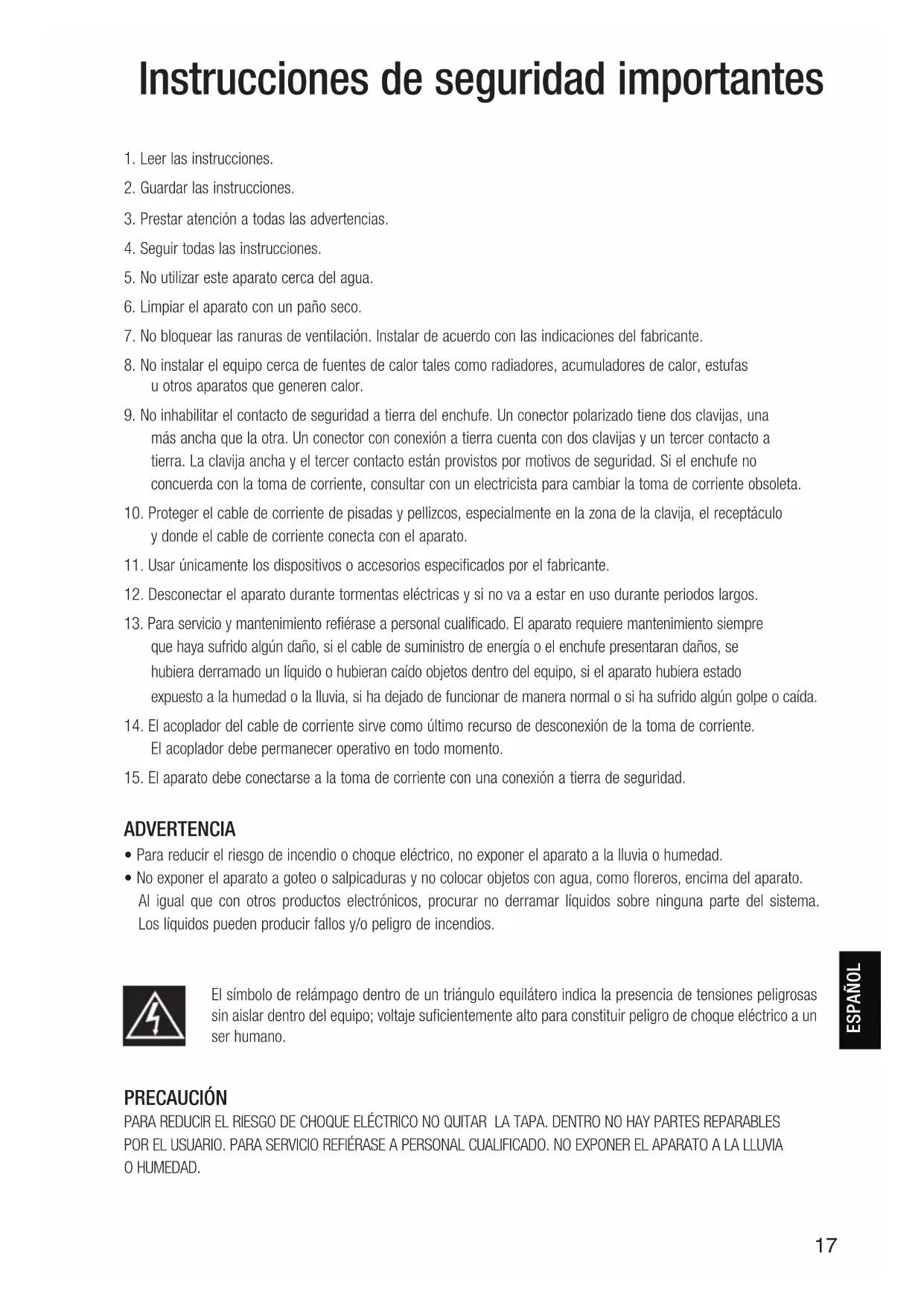 - No exponer el aparato a goteo o salpicaduras y no colocar objetos con agua, como floreros, encima del aparato. Al igual que con otros productos electrónicos, procurar no derramar líquidos sobre ninguna parte del sistema. Los líquidos pueden producir fallos y/o peligro de incendios. El símbolo de relámpago dentro de un triángulo equilátero indica la presencia de tensiones peligrosas sin aislar dentro del equipo; voltaje suficientemente alto para constituir peligro de choque eléctrico a un ser humano. PRECAUCIÓN PARA REDUCIR EL RIESGO DE CHOQUE ELÉCTRICO NO QUITAR LA TAPA. DENTRO NO HAY PARTES REPARABLES POR EL USUARIO. PARA SERVICIO REFIÉRASE A PERSONAL CUALIFICADO. NO EXPONER EL APARATO A LA LLUVIA O HUMEDAD.