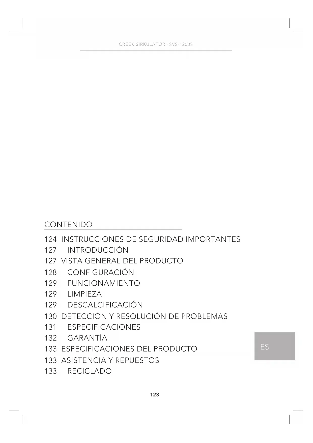 128 CONFIGURACIÓN 129 FUNCIONAMIENTO 129 LIMPIEZA 129 DESCALCIFICACIÓN 130 DETECCIÓN Y RESOLUCIÓN DE PROBLEMAS 131 ESPECIFICACIONES 132 GARANTÍA