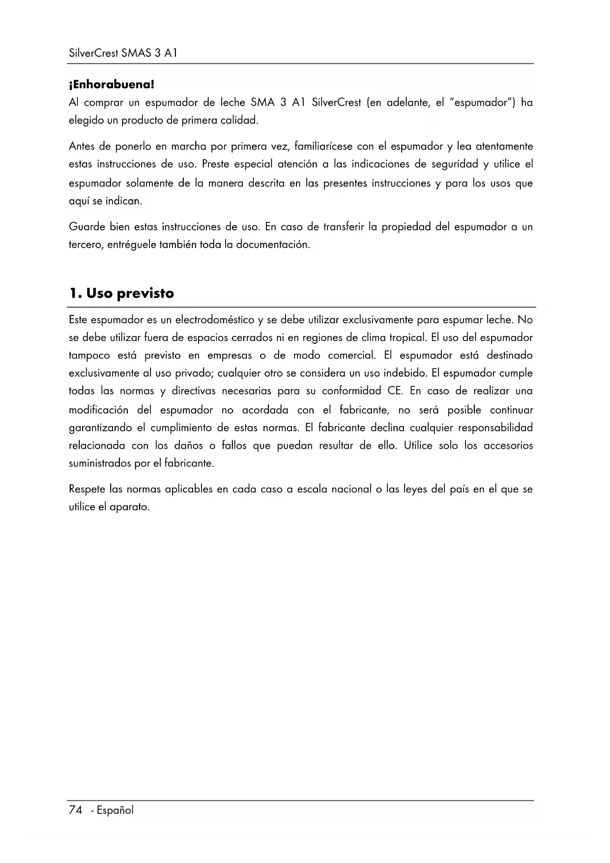 ¡Enhorabuena! Al comprar un espumador de leche SMA 3 A1 SilverCrest (en adelante, el “espumador”) ha elegido un producto de primera calidad. Antes de ponerlo en marcha por primera vez, familiarícese con el espumador y lea atentamente estas instrucciones de uso. Preste especial atención a las indicaciones de seguridad y utilice el espumador solamente de la manera descrita en las presentes instrucciones y para los usos que aquí se indican. Guarde bien estas instrucciones de uso. En caso de transferir la propiedad del espumador a un tercero, entréguele también toda la documentación.
