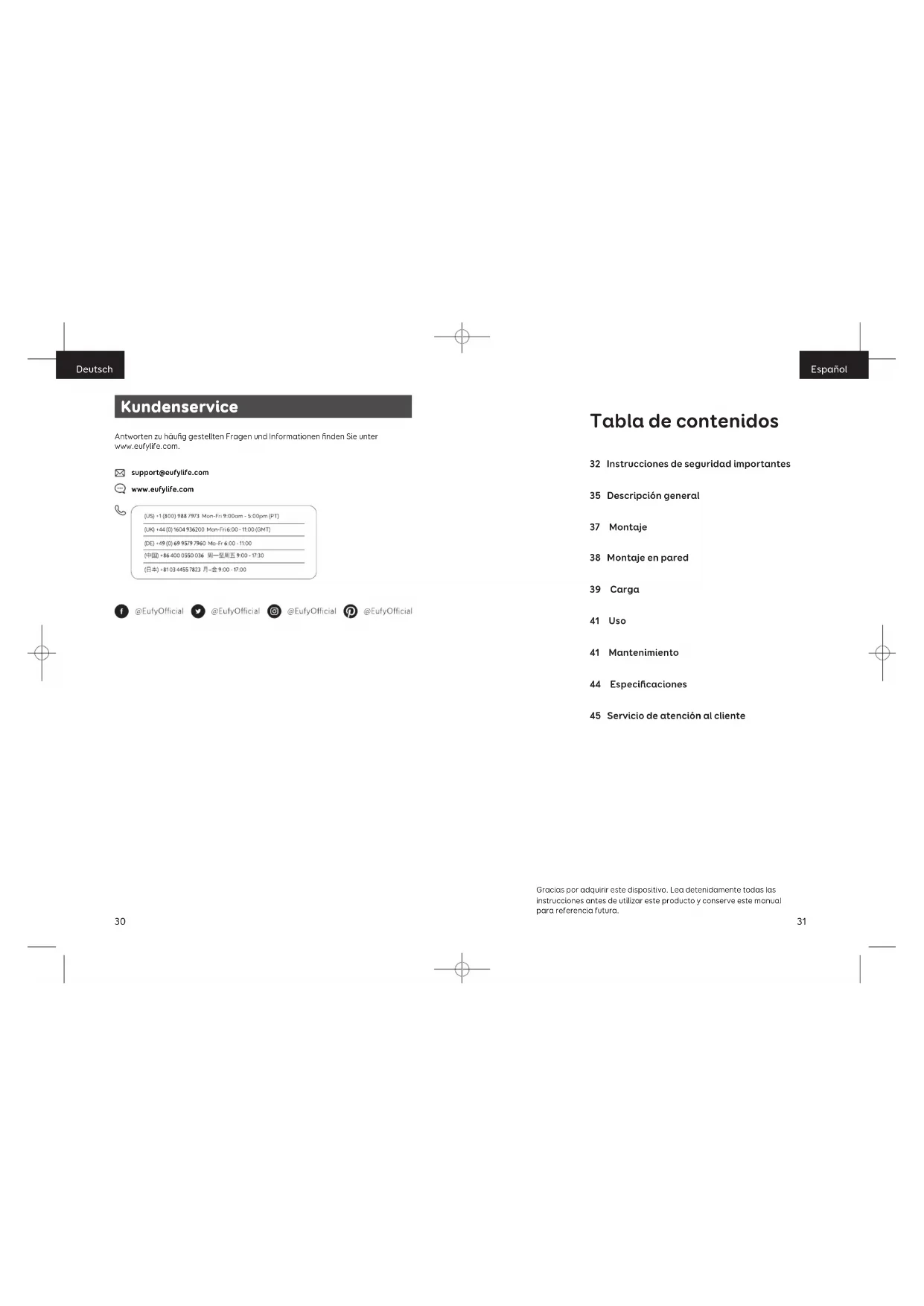 support@eufylife.com www.eufylife.com Gracias por adquirir este dispositivo. Lea detenidamente todas las instrucciones antes de utilizar este producto y conserve este manual para referencia futura. Tabla de contenidos 32 Instrucciones de seguridad importantes 35 Descripción general 37 Montaje 38 Montaje en pared 39 Carga 41 Uso 41 Mantenimiento 44 Especificaciones 45 Servicio de atención al clienteEspañol Español