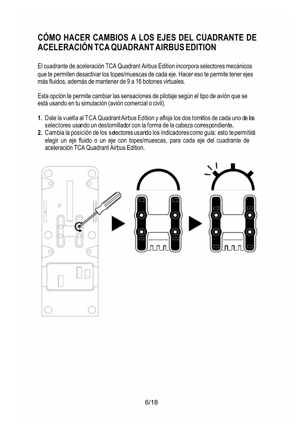 elegir un eje fluido o un eje con topes/muescas, para cada eje del cuadrante de aceleración TCA Quadrant Airbus Edition.7/18 CÓMO DESACTIVAR LOS INVERSORES DE EMPUJE DEL CUADRANTE DE ACELERACIÓN TCA QUADRANT AIRBUS EDITION El cuadrante de aceleración TCA Quadrant Airbus Edition incorpora inversores de empuje funcionales, que replican a los que se encuentran en los aceleradores de la aviación comercial de Airbus. Puedes desactivar el mecanismo inversor de empuje para obtener un pilotaje más adecuado a la aviación civil.