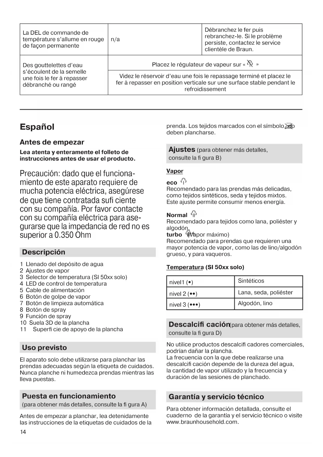 Videz le réservoir d’eau une fois le repassage terminé et placez le fer à repasser en position verticale sur une surface stable pendant le refroidissement Español Antes de empezar Lea atenta y enteramente el folleto de instrucciones antes de usar el producto. Precaución: dado que el funciona- miento de este aparato requiere de mucha potencia eléctrica, asegúrese de que tiene contratada sufi ciente con su compañía. Por favor contacte con su compañía eléctrica para ase- gurarse que la impedancia de red no es superior a 0.350 Ohm Descripción 1 Llenado del depósito de agua 2 Ajustes de vapor 3 Selector de temperatura (SI 50xx solo) 4 LED de control de temperatura 5 Cable de alimentación 6 Botón de golpe de vapor 7 Botón de limpieza automática 8 Botón de spray 9 Función de spray 10 Suela 3D de la plancha 11 Superfi cie de apoyo de la plancha Uso previsto El aparato solo debe utilizarse para planchar las prendas adecuadas según la etiqueta de cuidados. Nunca planche ni humedezca prendas mientras las lleva puestas. Puesta en funcionamiento (para obtener más detalles, consulte la fi gura A) Antes de empezar a planchar, lea detenidamente las instrucciones de la etiquetas de cuidados de la prenda. Los tejidos marcados con el símbolo no deben plancharse. Ajustes (para obtener más detalles, consulte la fi gura B) Vapor eco Recomendado para las prendas más delicadas, como tejidos sintéticos, seda y tejidos mixtos. Este ajuste permite consumir menos energía. Normal Recomendado para tejidos como lana, poliéster y algodón. turbo (Vapor máximo) Recomendado para prendas que requieren una mayor potencia de vapor, como las de lino/algodón grueso, y para vaqueros. Temperatura (SI 50xx solo) nivel1 (•) Sintéticos nivel 2 (••) Lana, seda, poliéster nivel 3 (•••) Algodón, lino Descalcifi cación (para obtener más detalles, consulte la fi gura D) No utilice productos descalcifi cadores comerciales, podrían dañar la plancha. La frecuencia con la que debe realizarse una descalcifi cación depende de la dureza del agua, la cantidad de vapor utilizado y la frecuencia y duración de las sesiones de planchado. Garantía y servicio técnico Para obtener información detallada, consulte el cuaderno de la garantía y el servicio técnico o visite www.braunhousehold.com. 5712710761_TS5_INT_01.indd 145712710761_TS5_INT_01.indd 14 09.04.20 15:0809.04.20 15:0815 Guía de resolución de problemas SI 50xx SI 51xx