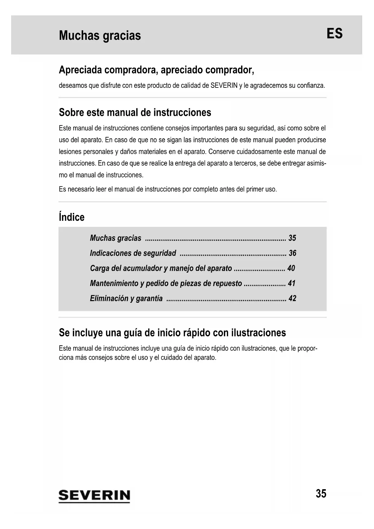 - Apparaat en accu afzonderlijk verwijderen Apparaten en accu's, die met dit symbool zijn aangeduid, moeten gescheiden van het huisvuil worden verwijderd! Apparaten en accu's bevatten waardevolle materia- len, die gerecycled kunnen worden. Een correcte verwijdering beschermt het milieu en de gezondheid van de medemens. Het apparaat en de uitgebouwde accu afzon- derlijk voor verwijdering naar de overeenkomstige inzamelpunten brengen. Garantie De wettelijke garantierechten voor de verkoper en evt. verkopergaranties worden niet aangetast door de onderstaande garantievoorwaarden. Mocht reparatie nodig zijn, neem telefonisch of via e-mail contact op met onze klantenser- vice. De contactgegevens vindt u in de bijlage van deze handleiding. Bij garantiegevallen kunt u als alternatief ook direct contact opnemen met de dealer. Bovendien geeft SEVERIN een fa- brieksgarantie van twee jaar vanaf de datum van aankoop. In deze periode repareren wij kosteloos alle gebreken, die aantoonbaar veroorzaakt worden door materiaal- of productiefouten en die de werking aanzienlijk verminderen. Verdere claims zijn uitgesloten. Van garantie uitgesloten is: Schade, die terug te voeren is op de niet-inachtneming van de handlei- ding, ondeskundige behandeling of normale slijtage, evenals licht breekbare onderdelen zoals glas, kunststof of LED's. Van de garantie uitgesloten zijn bovendien batterijen en accu's die als gevolg van normale slijtage of ondeskundig gebruik defect zijn geraakt resp. waarvan de looptijd is verkort. De garantie komt te vervallen bij ingreep door instanties die niet door SEVERIN geautoriseerd zijn.35 Muchas gracias 1 Muchas gracias Apreciada compradora, apreciado comprador, deseamos que disfrute con este producto de calidad de SEVERIN y le agradecemos su confianza. Sobre este manual de instrucciones Este manual de instrucciones contiene consejos importantes para su seguridad, así como sobre el uso del aparato. En caso de que no se sigan las instrucciones de este manual pueden producirse lesiones personales y daños materiales en el aparato. Conserve cuidadosamente este manual de instrucciones. En caso de que se realice la entrega del aparato a terceros, se debe entregar asimis- mo el manual de instrucciones. Es necesario leer el manual de instrucciones por completo antes del primer uso. Índice Muchas gracias p. 35