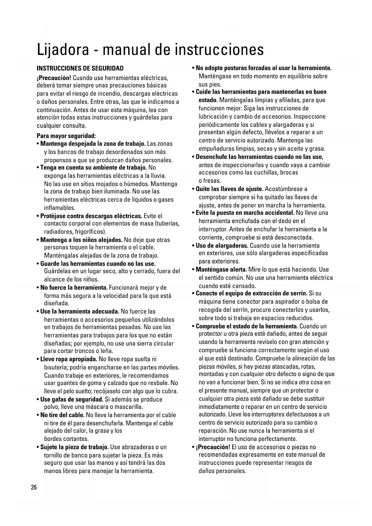 ¡Precaución! Cuando use herramientas eléctricas, deberá tomar siempre unas precauciones básicas para evitar el riesgo de incendio, descargas eléctricas o daños personales. Entre otras, las que le indicamos a continuación. Antes de usar esta máquina, lea con atención todas estas instrucciones y guárdelas para cualquier consulta. Para mayor seguridad: