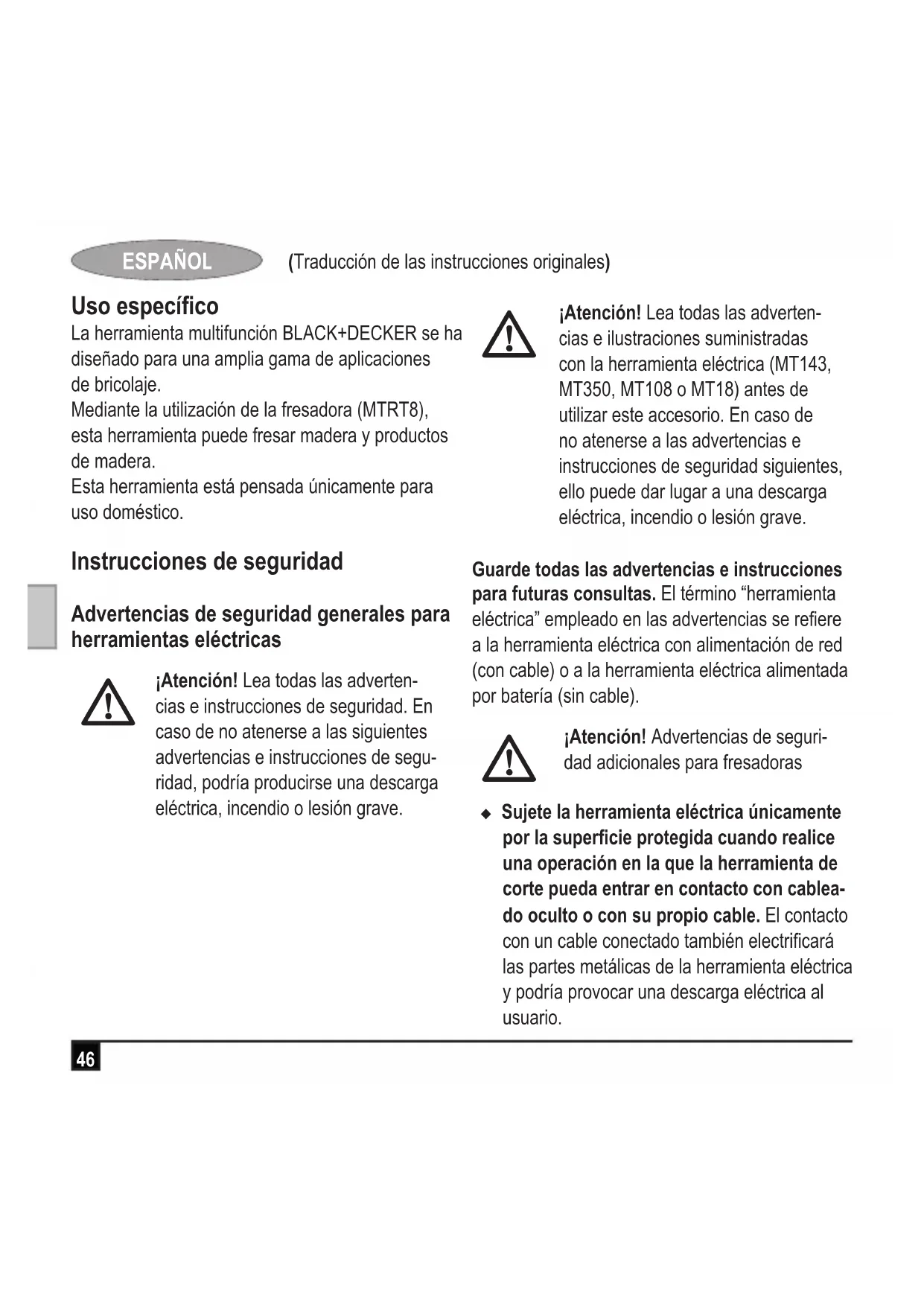 ¡Atención! Lea todas las adverten- cias e ilustraciones suministradas con la herramienta eléctrica (MT143, MT350, MT108 o MT18) antes de utilizar este accesorio. En caso de no atenerse a las advertencias e instrucciones de seguridad siguientes, ello puede dar lugar a una descarga eléctrica, incendio o lesión grave. Guarde todas las advertencias e instrucciones para futuras consultas. El término “herramienta eléctrica” empleado en las advertencias se reere a la herramienta eléctrica con alimentación de red (con cable) o a la herramienta eléctrica alimentada por batería (sin cable).