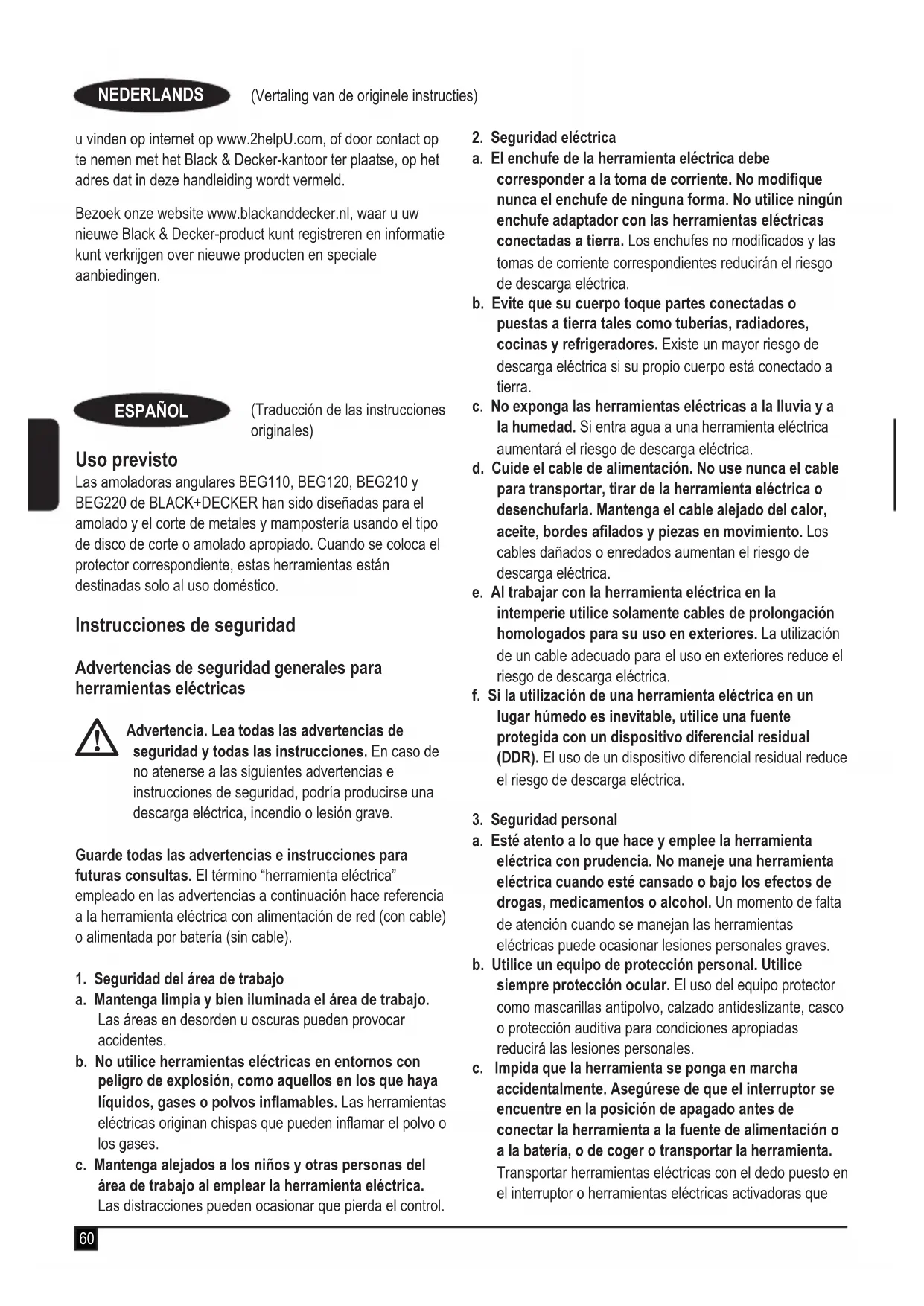 Amoladora angular BEG110, BEG120, BEG210, BEG220 Black & Decker declara que los productos descritos en “datos técnicos” cumplen las siguientes normas: 2006/42/CE, EN 60745-1:2009 + A11:2010; EN 60745-2-3:2011 + A2:2013 + A11:2014 + A12:2014 + A13:2015 Estos productos también cumplen las Directivas 2014/30/UE y 2011/65/UE. Para más información, póngase en contacto con Black & Decker en la siguiente dirección o consulte la parte posterior del manual. El abajo rmante es el responsable de la compilación del archivo técnico y realiza esta declaración en representación de Black & Decker. R. Laverick Director de Ingeniería Black & Decker Europa, 210 Bath Road, Slough, Berkshire, SL1 3YD Reino Unido 27/09/2017 Garantía Black & Decker confía en la calidad de sus productos y ofrece a los consumidores una garantía de 24 meses a partir de la fecha de compra. Esta garantía es adicional a sus derechos legales y no los menoscaba en modo alguno. La garantía es válida dentro de los territorios de los Estados Miembros de la Unión Europea y del Área de Libre Comercio Europea. Para reclamar la garantía, la reclamación se debe presentar de conformidad con las condiciones de Black & Decker. Tendrá que adjuntar un justicante de compra al vendedor o al agente técnico autorizado. Las condiciones de la garantía de 2 años de Black & Decker y la ubicación de su agente técnico autorizado más cercano se pueden obtener en Internet en www.2helpU.com o poniéndose en contacto con su ocina local de Black & Decker en la dirección que se indica en este manual. Visite nuestro sitio web www.blackanddecker.co.uk para registrar su nuevo producto Black & Decker y recibir noticias sobre nuevos productos y ofertas especiales.72 (Tradução das instruções originais) PORTUGUÊS d. Manuseie o cabo com cuidado. Nunca o utilize para transportar, puxar ou desligar a ferramenta elétrica. Mantenha o cabo afastado de fontes de calor, substâncias oleosas, arestas aadas ou peças móveis. Os cabos danicados ou emaranhados aumentam o risco de choque elétrico. e. Quando trabalhar com uma ferramenta elétrica ao ar livre, utilize uma extensão adequada para esse m. A utilização de um cabo adequado para uso ao ar livre reduz o risco de choque elétrico. f. Se for inevitável trabalhar com uma ferramenta elétrica num local húmido, utilize um dispositivo de corrente residual (RCD). A utilização de um RCD reduz o risco de choque elétrico.
