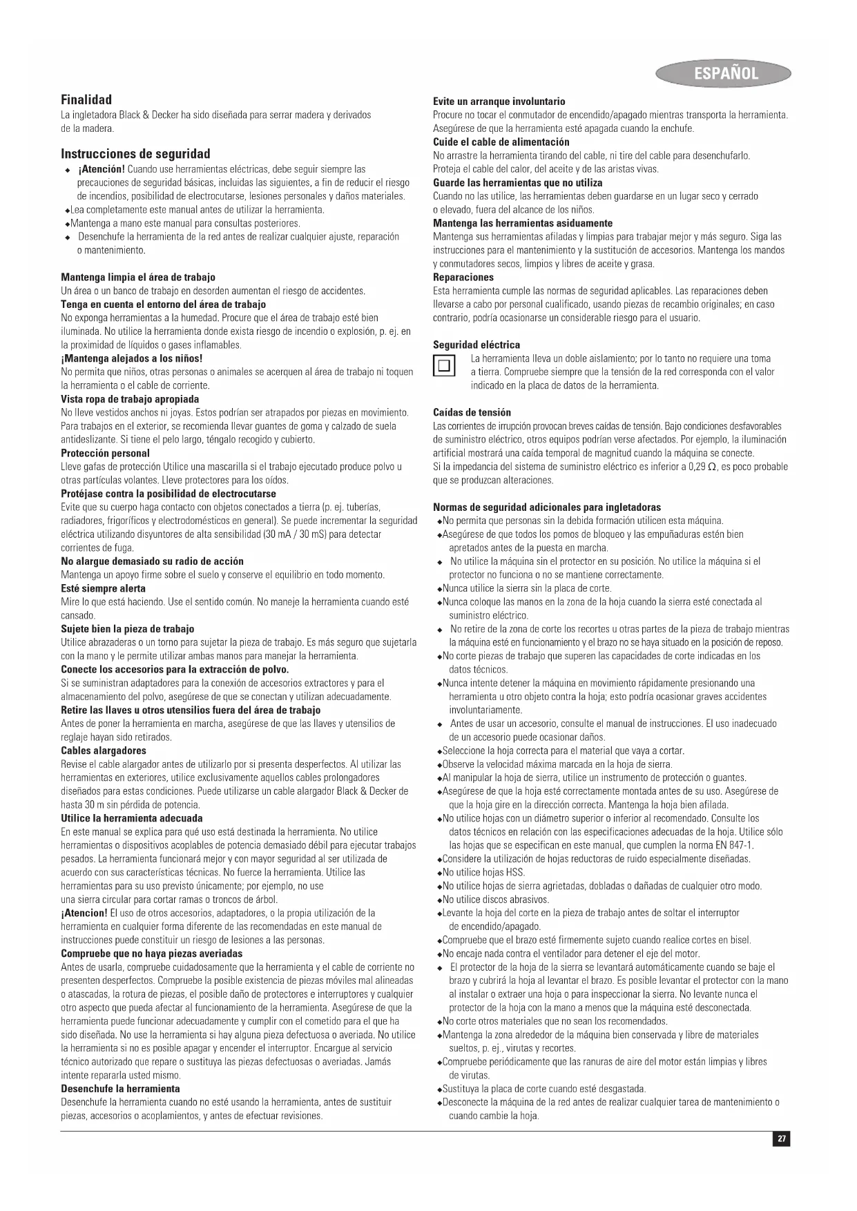 (meetonzekerheid geluidsvermogen) 3 dB(A) Kevin Hewitt Director of Consumer Engineering Spennymoor, County Durham DL16 6JG, Verenigd Koninkrijk 1-7-2005 Garantie Black & Decker heeft vertrouwen in zijn producten en biedt een uitstekende garantie. Deze garantiebepalingen vormen een aanvulling op uw wettelijke rechten en beperken deze niet. De garantie geldt in de lidstaten van de Europese Unie en de Europese Vrijhandelsassociatie. Mocht uw Black & Decker XT-product (behalve accessoires, hulpstukken, accu’s, laders en boorhouders) binnen 3 jaar na datum van aankoop defect raken tengevolge van materiaal- of constructiefouten, garanderen wij de vervanging van defecte onderdelen, de reparatie van het product of de vervanging van deze producten, op voorwaarde dat het product geregistreerd is via de Black & Decker website voor de garantie van XT-producten. Indien het product niet geregistreerd is dan geldt alleen de standaard garantie (2 jaar). De garantie geldt niet wanneer: ◆ Het product is gebruikt voor handelsdoeleinden, professionele toepassingen of verhuurdoeleinden; ◆ Het product onoordeelkundig is gebruikt; ◆ Het product is beschadigd door invloeden van buitenaf of door een ongeval; ◆ Poging tot reparatie is uitgevoerd door onbevoegde personen; ◆ Het product op welke manier dan ook is aangepast op basis van de oorspronkelijke specificaties; ◆ Ongeschikte accessoires of hulpstukken zijn gebruikt. De verlengde garantie geldt niet wanneer: ◆ De aankoopbon of het originele garantiecertificaat van verlenging niet kan worden aangetoond. Registreer uw product nu on-line via www.blackanddecker.nl/xt om in aanmerking te komen voor de verlengde garantie (3 jaar), en om op de hoogte te blijven van nieuwe producten en speciale aanbiedingen. Om een beroep op de garantie te doen, dient u een aankoopbewijs te overhandigen aan de verkoper of een van onze servicecentra. U kunt het adres van het dichtstbijzijnde servicecentrum opvragen via de adressen op de achterzijde van deze handleiding. U kunt ook een lijst van onze servicecentra en meer informatie m.b.t. onze klantenservice vinden op het volgende Internet-adres: www.2helpU.com Verdere informatie over het merk Black & Decker en onze producten vindt u op www.blackanddecker.nl27 ESPAÑOL Finalidad La ingletadora Black & Decker ha sido diseñada para serrar madera y derivados de la madera. Instrucciones de seguridad ◆ ¡Atención! Cuando use herramientas eléctricas, debe seguir siempre las precauciones de seguridad básicas, incluidas las siguientes, a fin de reducir el riesgo de incendios, posibilidad de electrocutarse, lesiones personales y daños materiales. ◆ Lea completamente este manual antes de utilizar la herramienta. ◆ Mantenga a mano este manual para consultas posteriores. ◆ Desenchufe la herramienta de la red antes de realizar cualquier ajuste, reparación o mantenimiento. Mantenga limpia el área de trabajo Un área o un banco de trabajo en desorden aumentan el riesgo de accidentes. Tenga en cuenta el entorno del área de trabajo No exponga herramientas a la humedad. Procure que el área de trabajo esté bien iluminada. No utilice la herramienta donde exista riesgo de incendio o explosión, p. ej. en la proximidad de líquidos o gases inflamables. ¡Mantenga alejados a los niños! No permita que niños, otras personas o animales se acerquen al área de trabajo ni toquen la herramienta o el cable de corriente. Vista ropa de trabajo apropiada No lleve vestidos anchos ni joyas. Estos podrían ser atrapados por piezas en movimiento. Para trabajos en el exterior, se recomienda llevar guantes de goma y calzado de suela antideslizante. Si tiene el pelo largo, téngalo recogido y cubierto. Protección personal Lleve gafas de protección Utilice una mascarilla si el trabajo ejecutado produce polvo u otras partículas volantes. Lleve protectores para los oídos. Protéjase contra la posibilidad de electrocutarse Evite que su cuerpo haga contacto con objetos conectados a tierra (p. ej. tuberías, radiadores, frigoríficos y electrodomésticos en general). Se puede incrementar la seguridad eléctrica utilizando disyuntores de alta sensibilidad (30 mA / 30 mS) para detectar corrientes de fuga. No alargue demasiado su radio de acción Mantenga un apoyo firme sobre el suelo y conserve el equilibrio en todo momento. Esté siempre alerta Mire lo que está haciendo. Use el sentido común. No maneje la herramienta cuando esté cansado. Sujete bien la pieza de trabajo Utilice abrazaderas o un torno para sujetar la pieza de trabajo. Es más seguro que sujetarla con la mano y le permite utilizar ambas manos para manejar la herramienta. Conecte los accesorios para la extracción de polvo. Si se suministran adaptadores para la conexión de accesorios extractores y para el almacenamiento del polvo, asegúrese de que se conectan y utilizan adecuadamente. Retire las llaves u otros utensilios fuera del área de trabajo Antes de poner la herramienta en marcha, asegúrese de que las llaves y utensilios de reglaje hayan sido retirados. Cables alargadores Revise el cable alargador antes de utilizarlo por si presenta desperfectos. Al utilizar las herramientas en exteriores, utilice exclusivamente aquellos cables prolongadores diseñados para estas condiciones. Puede utilizarse un cable alargador Black & Decker de hasta 30 m sin pérdida de potencia. Utilice la herramienta adecuada En este manual se explica para qué uso está destinada la herramienta. No utilice herramientas o dispositivos acoplables de potencia demasiado débil para ejecutar trabajos pesados. La herramienta funcionará mejor y con mayor seguridad al ser utilizada de acuerdo con sus características técnicas. No fuerce la herramienta. Utilice las herramientas para su uso previsto únicamente; por ejemplo, no use una sierra circular para cortar ramas o troncos de árbol. ¡Atencion! El uso de otros accesorios, adaptadores, o la propia utilización de la herramienta en cualquier form