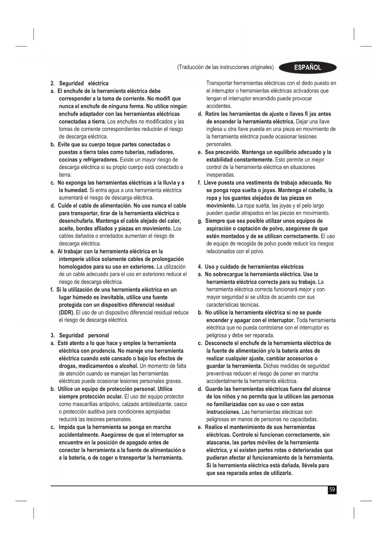 a. Mantenga limpia y bien iluminada el área de trabajo. Las áreas en desorden u oscuras pueden provocar accidentes. b. No utilice herramientas eléctricas en entornos con peligro de explosión, como aquellos en los que haya líquidos, gases o polvos infl amables. Las herramientas eléctricas originan chispas que pueden infl amar el polvo o los gases. c. Mantenga alejados a los niños y otras personas del área de trabajo al emplear la herramienta eléctrica. Las distracciones pueden ocasionar que pierda el control. (Traducción de las instrucciones originales) ESPAÑOL59 (Traducción de las instrucciones originales) ESPAÑOL
