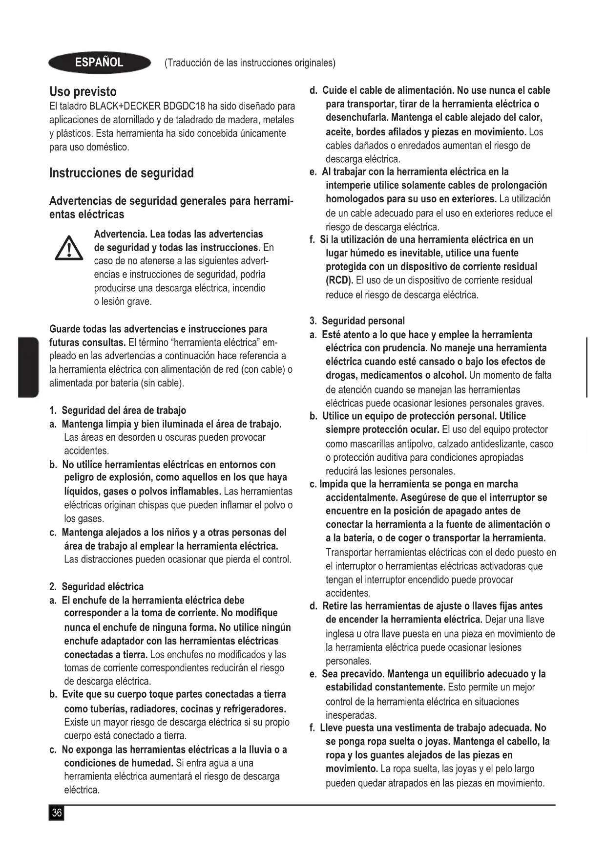 Estos productos también cumplen con las Directivas 2004/108/CE (hasta el 19/04/2016), 2014/30/UE (desde el 20/04/2016) y 2011/65/UE. Para más información, póngase en contacto con Black & Decker en la siguiente dirección o consulte la parte posterior del manual. El que suscribe es responsable de la compilación del archivo técnico y realiza esta declaración en nombre de Black & Decker. R. Laverick Director de ingeniería Black & Decker Europa, 210 Bath Road, Slough, Berkshire, SL1 3YD Reino Unido 18/11/2015 Garantía Black & Decker confía en la calidad de sus productos y ofrece a los consumidores una garantía de 24 meses a partir de la fecha de compra. Esta garantía es adicional a sus derechos legales y no los menoscaba en modo alguno. La garantía es válida dentro de los territorios de los Estados Miembros de la Unión Europea y del Área de Libre Comercio Europea. Para reclamar la garantía, la reclamación se debe presentar de conformidad con las condiciones de Black & Decker. Tendrá que adjuntar un justicante de compra al vendedor o al agente técnico autorizado. Las condiciones de la garantía de 2 años de Black & Decker y la ubicación de su agente técnico autorizado más cercano se pueden obtener en Internet en www.2helpU.com o ponién- dose en contacto con su ocina local de Black & Decker en la dirección que se indica en este manual. Visite nuestro sitio web www.blackanddecker.co.uk para registrar su nuevo producto Black & Decker y recibir noticias sobre nuevos productos y ofertas especiales.43 (Tradução das instruções originais) PORTUGUÊS Utilização pretendida O seu berbequim BLACK+DECKER BDGDC18 foi concebido para aparafusar e para perfurar madeira, metal e plástico. Esta ferramenta destina-se apenas a utilização doméstica. Instruções de segurança Avisos de segurança gerais para ferramentas eléctricas
