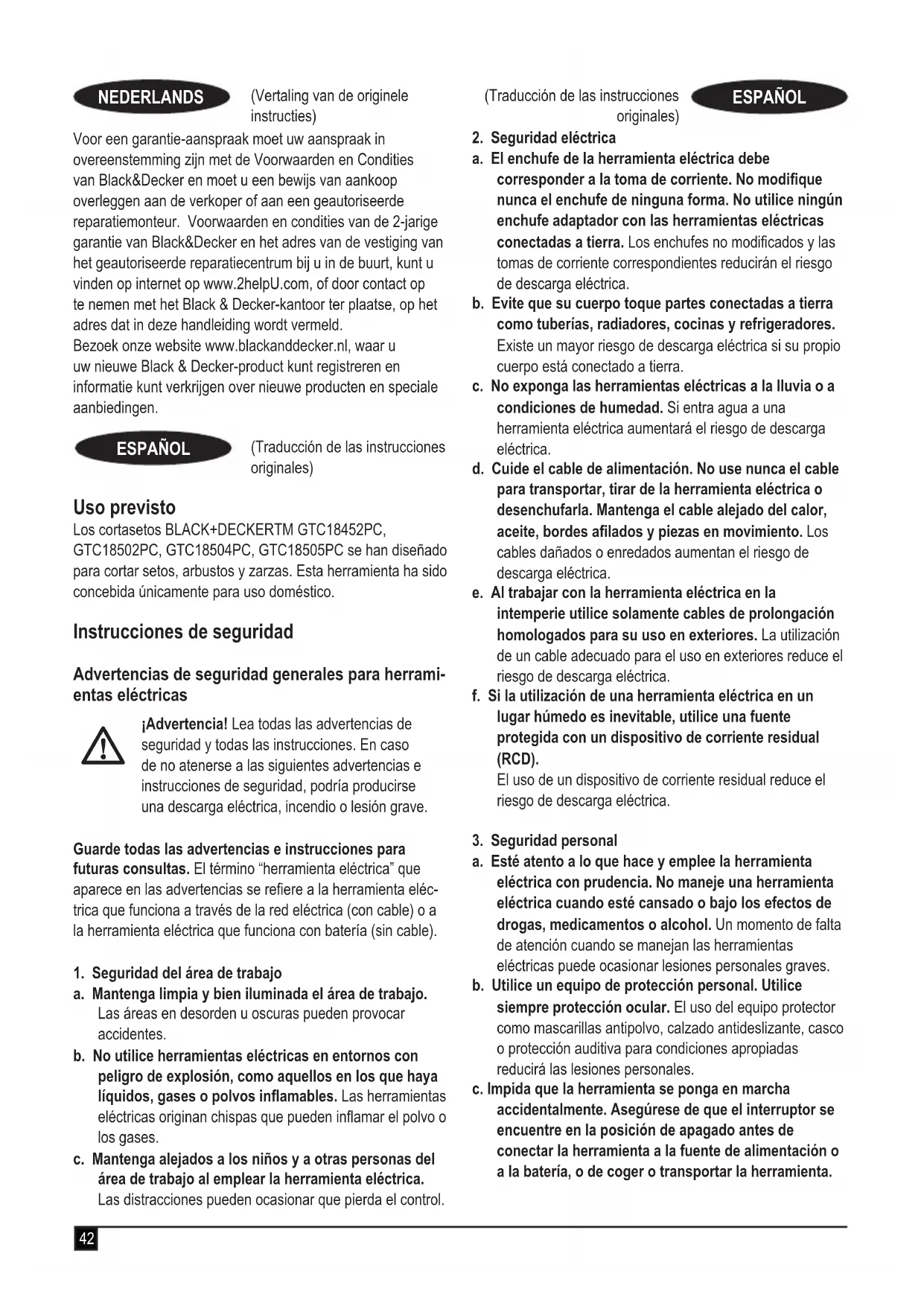 ) dB Estos productos también cumplen con las Directivas 2014/30/EU y 2011/65/UE. Si desea más información, póngase en contacto con Black & Decker en la dirección indicada a continuación o bien consulte la parte posterior de este manual. El abajo rmante es responsable de la elaboración del expediente técnico y realiza esta declaración en nombre de Black & Decker. Becky Cotsworth Director - Grupo de productos al aire libre Black & Decker Europe, 270 Bath Road, Slough, Berkshire, SL1 4DX Reino Unido 23/10/2015 Garantía Black & Decker confía en la calidad de sus productos y ofrece a los consumidores una garantía de 24 meses a partir de la fecha de compra. Esta garantía es adicional a sus derechos legales y no los menoscaba en modo alguno. La garantía es válida dentro de los territorios de los Estados Miembros de la Unión Europea y del Área de Libre Comercio Europea. Para reclamar la garantía, la reclamación se debe presentar de conformidad con las condiciones de Black & Decker. Ten- drá que adjuntar un justicante de compra al vendedor o al agente técnico autorizado. Las condiciones de la garantía de 2 años de Black & Decker y la ubicación de su agente técnico autorizado más cercano se pueden obtener en Internet en www.2helpU.com o poniéndose en contacto con su ocina local de Black & Decker en la dirección que se indica en este manual. Visite nuestro sitio web www.blackanddecker.co.uk para registrar su nuevo producto Black & Decker y recibir noticias sobre nuevos productos y ofertas especiales. (Tradução das instruções originais) PORTUGUÊS Utilização pretendida Os corta-sebes BLACK+DECKERTM GTC18452PC, GTC18502PC, GTC18504PC, GTC18505PC foram conce- bidos para cortar sebes, arbustos e rubos. Esta ferramenta destina-se apenas a utilização doméstica. Instruções de segurança Avisos de segurança gerais para ferramentas eléctricas