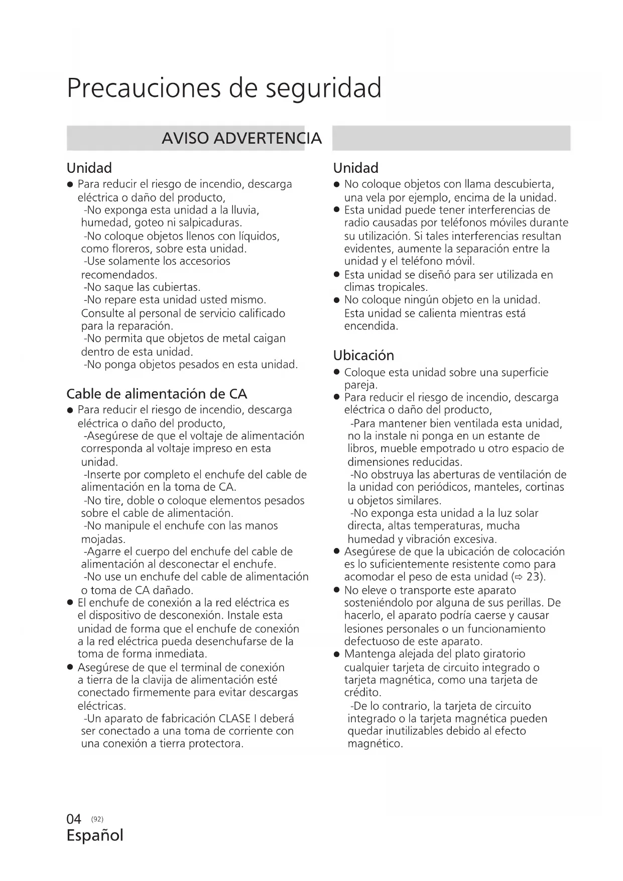Precauciones de seguridad AVISO ADVERTENCIA Unidad