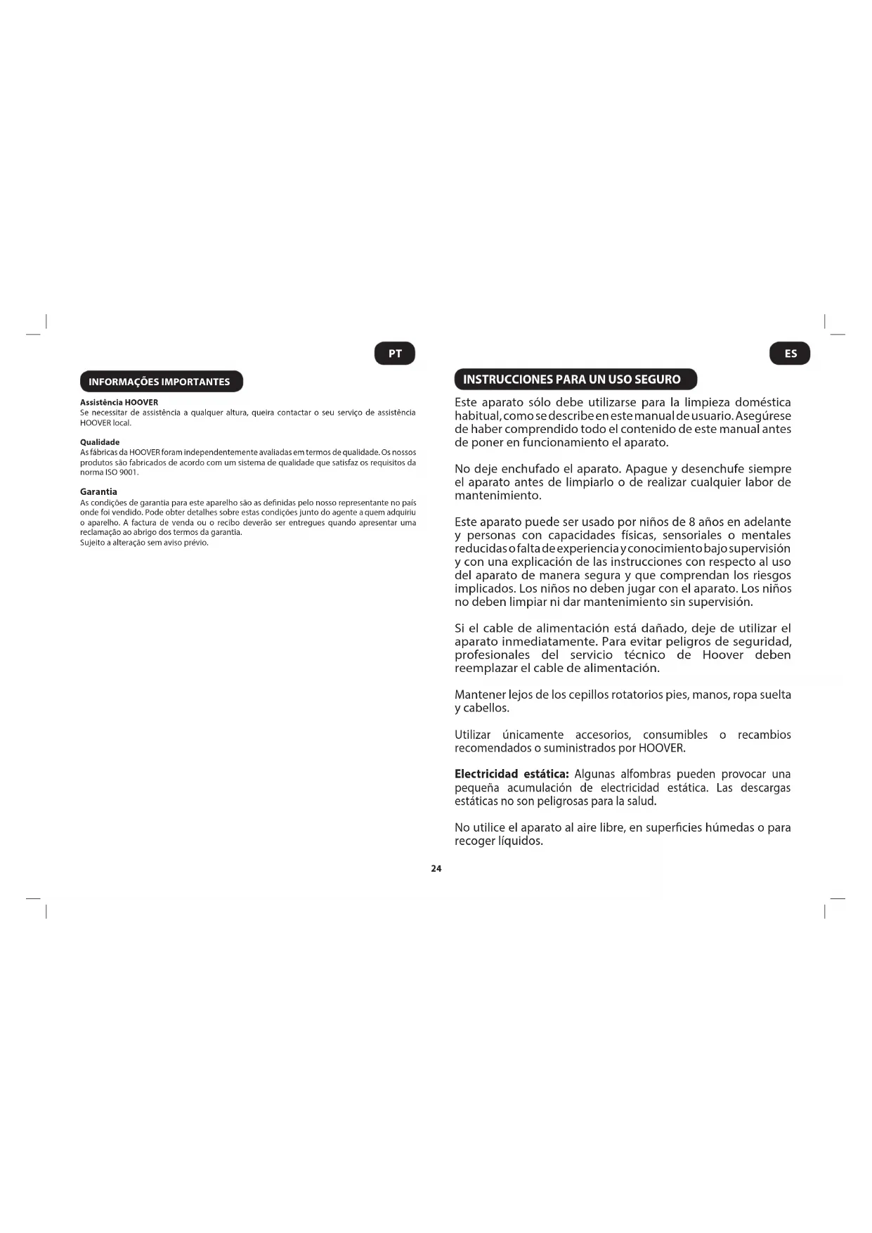 Para obtener el mejor rendimiento y eciencia se recomienda utilizar toberas adecuadas para las principales operaciones de limpieza. Estas toberas se indican en los diagramas con las letras GP, HF o CA. Una tobera de tipo GP se puede utilizar para limpiar tanto alfombras como suelos duros. Una tobera de tipo HF es adecuada sólo para la limpieza de suelos duros. Una tobera de tipo CA es adecuada sólo para la limpieza de alfombras. Las demás toberas son accesorios para efectuar tareas de limpieza especializadas y se recomiendan sólo para un uso ocasional. B. Controlar el tubo exible sacándolo del lugar en donde se encuentra la empuñadura de la manguera, alargándolo hasta el máximo. C. Controlar la boca de entrada del contenedor sacando este último e inspeccionado su interior. D. Quitar la tobera y controlar su conexión. E. Retirar el tubo para la inspeción de bloqueo y controlarla a ambos lados. (Fig. 14) IMPORTANTE Antes de controlar el aspirador, apague el aparato y saque el enchufe de la toma de corriente.28 Servicio técnico HOOVERSi en cualquier momento necesitara atención técnica, diríjase al Servicio Técnico de HOOVER.CalidadLas fábricas de HOOVER han sido sometidas a inspecciones de calidad independientes. Nuestros productos se fabrican de conformidad con un sistema de calidad que cumple los requisitos de la norma ISO 9001. Su garantía Las condiciones de garantía para este aparato vienen denidas por nuestro representante en el país de venta. Puede obtener los detalles acerca de estas condiciones en el establecimiento donde haya comprado este aparato. Debe mostrarse la factura de compra o el recibo al hacer alguna reclamación en virtud de las condiciones de garantía.Sujeto a cambios sin previo aviso.