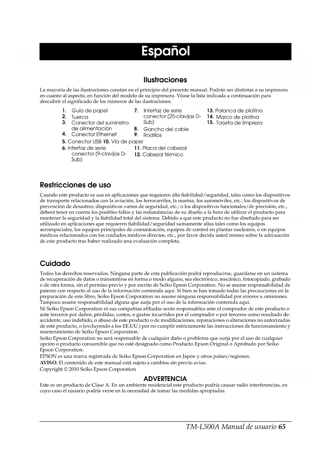 pagina 60).TM-L500A Manual de usuario 65 Español Español Ilustraciones La mayoría de las ilustraciones constan en el principio del presente manual. Podrán ser distintas a su impresora en cuanto al aspecto, en función del modelo de su impresora. Véase la lista indicada a continuación para descubrir el significado de los números de las ilustraciones. Restricciones de uso Cuando este producto se usa en aplicaciones que requieren alta fiabilidad/seguridad, tales como los dispositivos de transporte relacionados con la aviación, los ferrocarriles, la marina, los automóviles, etc.; los dispositivos de prevención de desastres; dispositivos varios de seguridad, etc.; o los dispositivos funcionales/de precisión, etc., deberá tener en cuenta los posibles fallos y las redundancias de su diseño a la hora de utilizar el producto para mantener la seguridad y la fiabilidad total del sistema. Debido a que este producto no fue diseñado para ser utilizado en aplicaciones que requieren fiabilidad/seguridad sumamente altas tales como los equipos aeroespaciales, los equipos principales de comunicación, equipos de control en plantas nucleares, o en equipos médicos relacionados con los cuidados médicos directos, etc., por favor decida usted mismo sobre la adecuación de este producto tras haber realizado una evaluación completa. Cuidado Todos los derechos reservados. Ninguna parte de esta publicación podrá reproducirse, guardarse en un sistema de recuperación de datos o transmitirse en forma o modo alguno, sea electrónico, mecánico, fotocopiado, grabado o de otra forma, sin el permiso previo y por escrito de Seiko Epson Corporation. No se asume responsabilidad de patente con respecto al uso de la información contenida aquí. Si bien se han tomado todas las precauciones en la preparación de este libro, Seiko Epson Corporation no asume ninguna responsabilidad por errores u omisiones. Tampoco asume responsabilidad alguna que surja por el uso de la información contenida aquí. Ni Seiko Epson Corporation ni sus compañías afiliadas serán responsables ante el comprador de este producto o ante terceros por daños, pérdidas, costos, o gastos incurridos por el comprador o por terceros como resultado de: accidente, uso indebido, o abuso de este producto o de modificaciones, reparaciones o alteraciones no autorizadas de este producto, o (excluyendo a los EE.UU.) por no cumplir estrictamente las instrucciones de funcionamiento y mantenimiento de Seiko Epson Corporation. Seiko Epson Corporation no será responsable de cualquier daño o problema que surja por el uso de cualquier opción o producto consumible que no esté designado como Producto Epson Original o Aprobado por Seiko Epson Corporation. EPSON es una marca registrada de Seiko Epson Corporation en Japón y otros países/regiones. AV I S O : El contenido de este manual está sujeto a cambios sin previo aviso. Copyright © 2010 Seiko Epson Corporation ADVERTENCIA Este es un producto de Clase A. En un ambiente residencial este producto podría causar radio interferencias, en cuyo caso el usuario podría verse en la necesidad de tomar las medidas apropiadas.