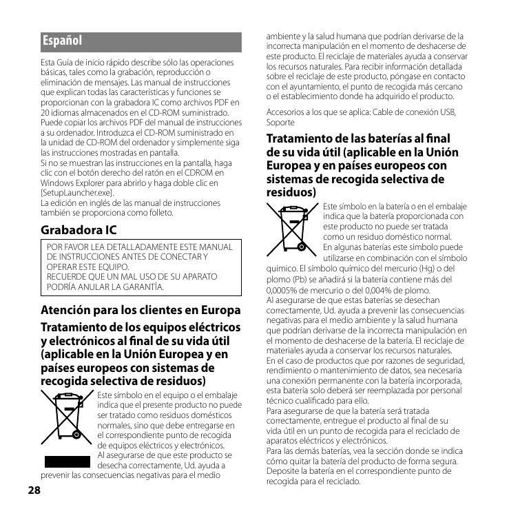 Español Esta Guía de inicio rápido describe sólo las operaciones básicas, tales como la grabación, reproducción o eliminación de mensajes. Las manual de instrucciones que explican todas las características y funciones se proporcionan con la grabadora IC como archivos PDF en 20 idiomas almacenados en el CD-ROM suministrado. Puede copiar los archivos PDF del manual de instrucciones a su ordenador. Introduzca el CD-ROM suministrado en la unidad de CD-ROM del ordenador y simplemente siga las instrucciones mostradas en pantalla. Si no se muestran las instrucciones en la pantalla, haga clic con el botón derecho del ratón en el CDROM en Windows Explorer para abrirlo y haga doble clic en [SetupLauncher.exe]. La edición en inglés de las manual de instrucciones también se proporciona como folleto. Atención para los clientes en Europa Tratamiento de los equipos eléctricos y electrónicos al final de su vida útil (aplicable en la Unión Europea y en países europeos con sistemas de recogida selectiva de residuos) Este símbolo en el equipo o el embalaje indica que el presente producto no puede ser tratado como residuos domésticos normales, sino que debe entregarse en el correspondiente punto de recogida de equipos eléctricos y electrónicos. Al asegurarse de que este producto se desecha correctamente, Ud. ayuda a prevenir las consecuencias negativas para el medio