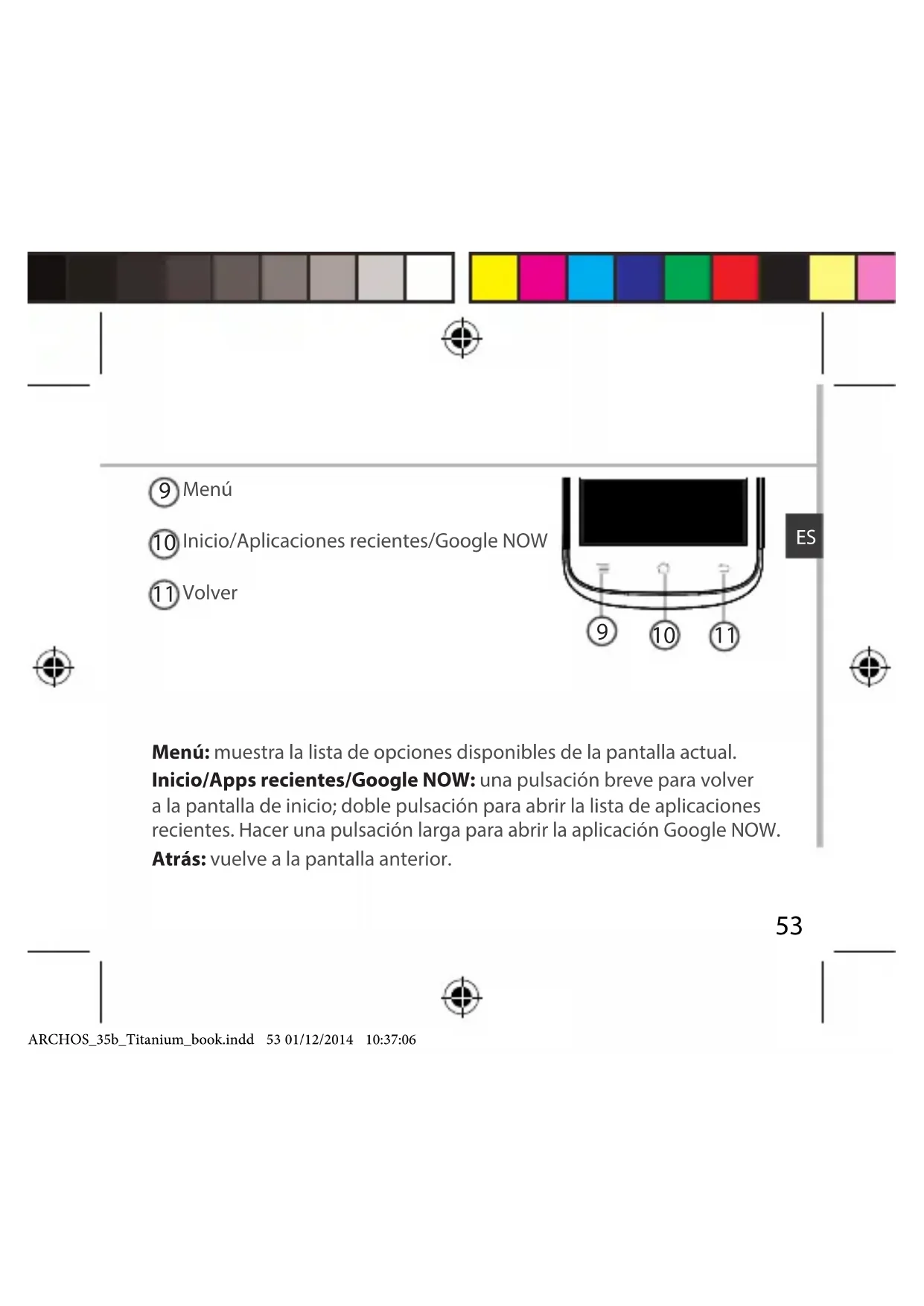 Menú Inicio/Aplicaciones recientes/Google NOW Volver Menú: muestra la lista de opciones disponibles de la pantalla actual. Inicio/Apps recientes/Google NOW: una pulsación breve para volver a la pantalla de inicio; doble pulsación para abrir la lista de aplicaciones recientes. Hacer una pulsación larga para abrir la aplicación Google NOW. Atrás: vuelve a la pantalla anterior. ARCHOS_35b_Titanium_book.indd 53 01/12/2014 10:37:0654 Ensamblado Abrir
