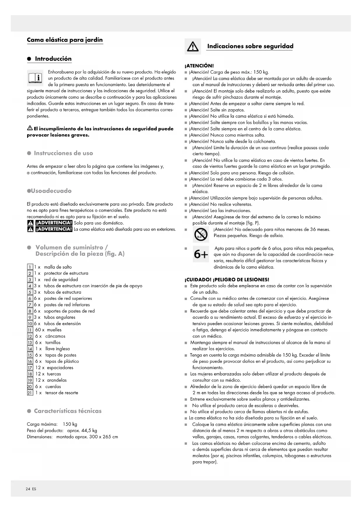 1 x tensor de resorte Características técnicas Carga máxima: 150 kg Peso del producto: aprox. 44,5 kg Dimensiones: montado aprox. 300 x 265 cm Indicaciones sobre seguridad ¡ATENCIÓN! ¡Atención! Carga de peso máx.: 150 kg. ¡Atención! La cama elástica debe ser montada por un adulto de acuerdo con el manual de instrucciones y deberá ser revisada antes del primer uso. ¡Atención! El montaje solo debe realizarlo un adulto, puesto que existe riesgo de sufrir pinchazos durante el montaje. ¡Atención! Antes de empezar a saltar cierre siempre la red. ¡Atención! Salte sin zapatos. ¡Atención! No utilice la cama elástica si está húmeda. ¡Atención! Salte siempre con los bolsillos y las manos vacías. ¡Atención! Salte siempre en el centro de la cama elástica. ¡Atención! Nunca coma mientras salta. ¡Atención! Nunca salte desde la colchoneta. ¡Atención! Limite la duración de un uso continuo (realice pausas cada cierto tiempo). ¡Atención! No utilice la cama elástica en caso de vientos fuertes. En caso de vientos fuertes guarde la cama elástica en un lugar protegido. ¡Atención! Solo para una persona. Riesgo de colisión. ¡Atención! La red debe cambiarse cada 3 años. ¡Atención! Reserve un espacio de 2 m libres alrededor de la cama elástica. ¡Atención! Utilización siempre bajo supervisión de personas adultas. ¡Atención! No realice volteretas. ¡Atención! Lea las instrucciones. ¡Atención! Asegúrese de tirar del extremo de la correa lo máximo posible durante el montaje (fig. P). ¡Atención! No adecuado para niños menores de 36 meses. Piezas pequeñas. Riesgo de asfixia. Apto para niños a partir de 6 años, para niños más pequeños, que aún no disponen de la capacidad de coordinación nece- saria, resultaría difícil gestionar las características físicas y dinámicas de la cama elástica. ¡CUIDADO! ¡PELIGRO DE LESIONES! Este producto solo debe emplearse en caso de contar con la supervisión de un adulto. Consulte con su médico antes de comenzar con el ejercicio. Asegúrese de que su estado de salud sea apto para el ejercicio. Recuerde que debe calentar antes del ejercicio y que debe practicar de acuerdo a su rendimiento actual. El exceso de esfuerzo y el ejercicio in- tensivo pueden ocasionar lesiones graves. Si siente molestias, debilidad o fatiga, detenga el ejercicio inmediatamente y póngase en contacto con un médico. Mantenga siempre el manual de instrucciones al alcance de la mano al realizar los ejercicios. Tenga en cuenta la carga máxima admisible de 150 kg. Exceder el límite de peso puede provocar daños en el producto, así como perjudicar su funcionamiento. Las mujeres embarazadas solo deben utilizar el producto después de consultar con su médico. Alrededor de la zona de ejercicio deberá quedar un espacio libre de 2 m en todas las direcciones desde las que se tenga acceso al producto. Entrene exclusivamente sobre suelos planos y antideslizantes. No utilice el producto cerca de escaleras o desniveles. No utilice el producto cerca de llamas abiertas ni de estufas. La cama elástica no ha sido diseñada para su fijación en el suelo. Coloque la cama elástica únicamente sobre superficies planas con una distancia de al menos 2 m respecto a obras u otros obstáculos como vallas, garajes, casas, ramas colgantes, tendederos o cables eléctricos. Las camas elásticas no deben colocarse encima de cemento, asfalto o demás superficies duras ni cerca de elementos que puedan resultar molestos (por ej. piscinas infantiles, columpios, toboganes o estructuras para trepar).25 ES No realice modificaciones en la cama elástica. Las tuercas autoblocantes