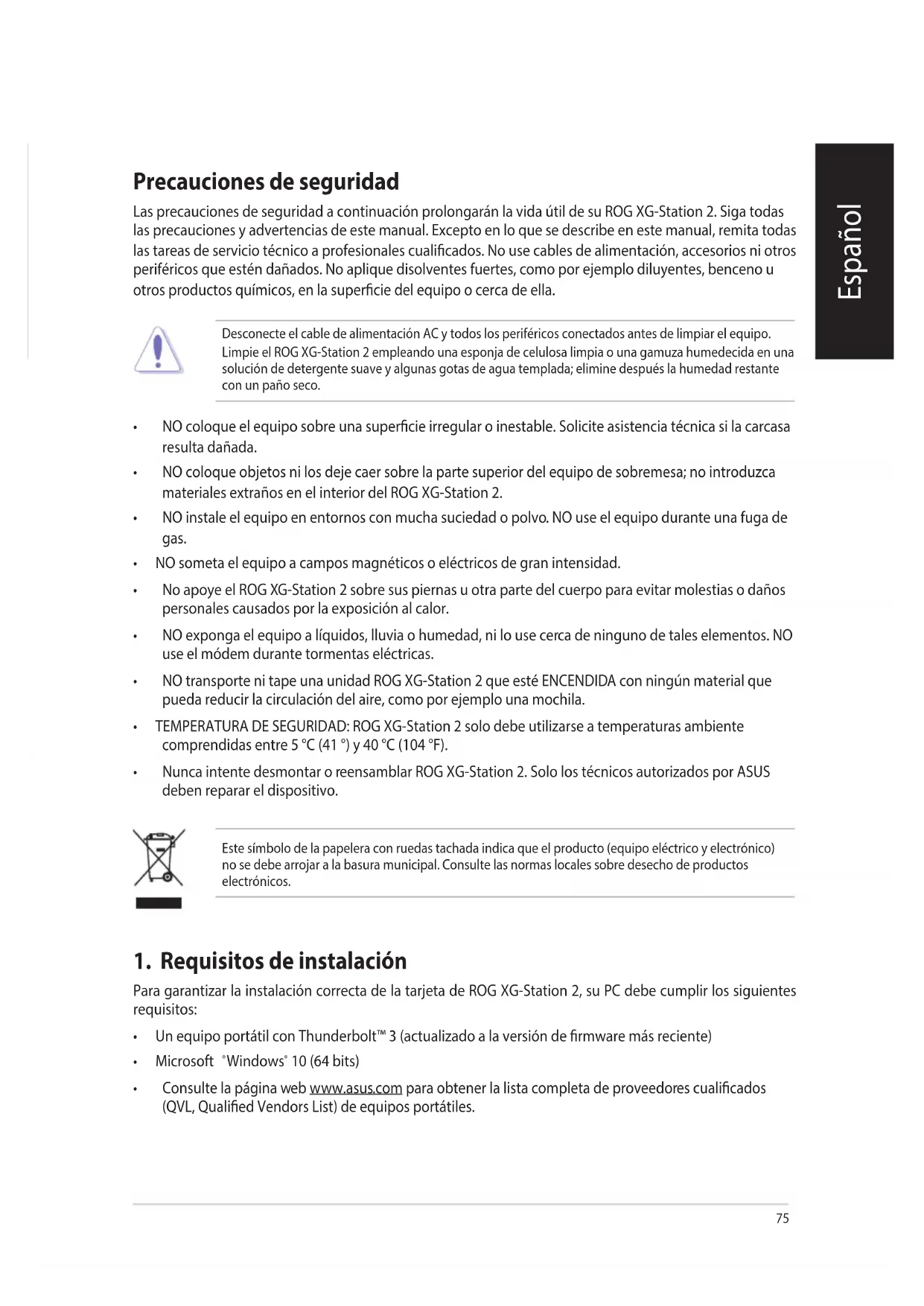 - Nunca intente desmontar o reensamblar ROG XG-Station 2. Solo los técnicos autorizados por ASUS deben reparar el dispositivo. Este símbolo de la papelera con ruedas tachada indica que el producto (equipo eléctrico y electrónico) no se debe arrojar a la basura municipal. Consulte las normas locales sobre desecho de productos electrónicos. English