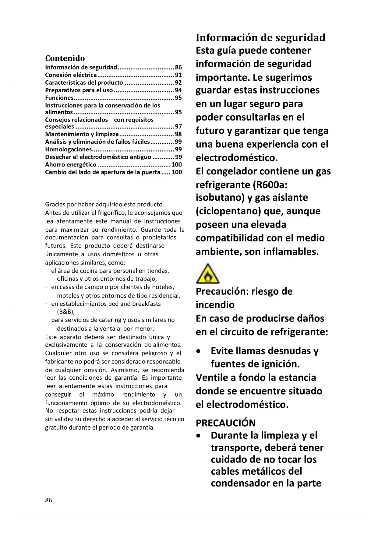 Gracias por haber adquirido este producto. Antes de utilizar el frigorífico, le aconsejamos que lea atentamente este manual de instrucciones para maximizar su rendimiento. Guarde toda la documentación para consultas o propietarios futuros. Este producto deberá destinarse únicamente a usos domésticos u otras aplicaciones similares, como: - el área de cocina para personal en tiendas, oficinas y otros entornos de trabajo, - en casas de campo o por clientes de hoteles, moteles y otros entornos de tipo residencial, - en establecimientos bed and breakfasts (B&B), - para servicios de catering y usos similares no destinados a la venta al por menor. Este aparato deberá ser destinado única y exclusivamente a la conservación de alimentos. Cualquier otro uso se considera peligroso y el fabricante no podrá ser considerado responsable de cualquier omisión. Asimismo, se recomienda leer las condiciones de garantía. Es importante leer atentamente estas instrucciones para conseguir el máximo rendimiento y un funcionamiento óptimo de su electrodoméstico. No respetar estas instrucciones podría dejar sin validez su derecho a acceder al servicio técnico gratuito durante el período de garantía. Información de seguridad Esta guía puede contener información de seguridad importante. Le sugerimos guardar estas instrucciones en un lugar seguro para poder consultarlas en el futuro y garantizar que tenga una buena experiencia con el electrodoméstico. El congelador contiene un gas refrigerante (R600a: isobutano) y gas aislante (ciclopentano) que, aunque poseen una elevada compatibilidad con el medio ambiente, son inflamables. Precaución: riesgo de incendio En caso de producirse daños en el circuito de refrigerante: