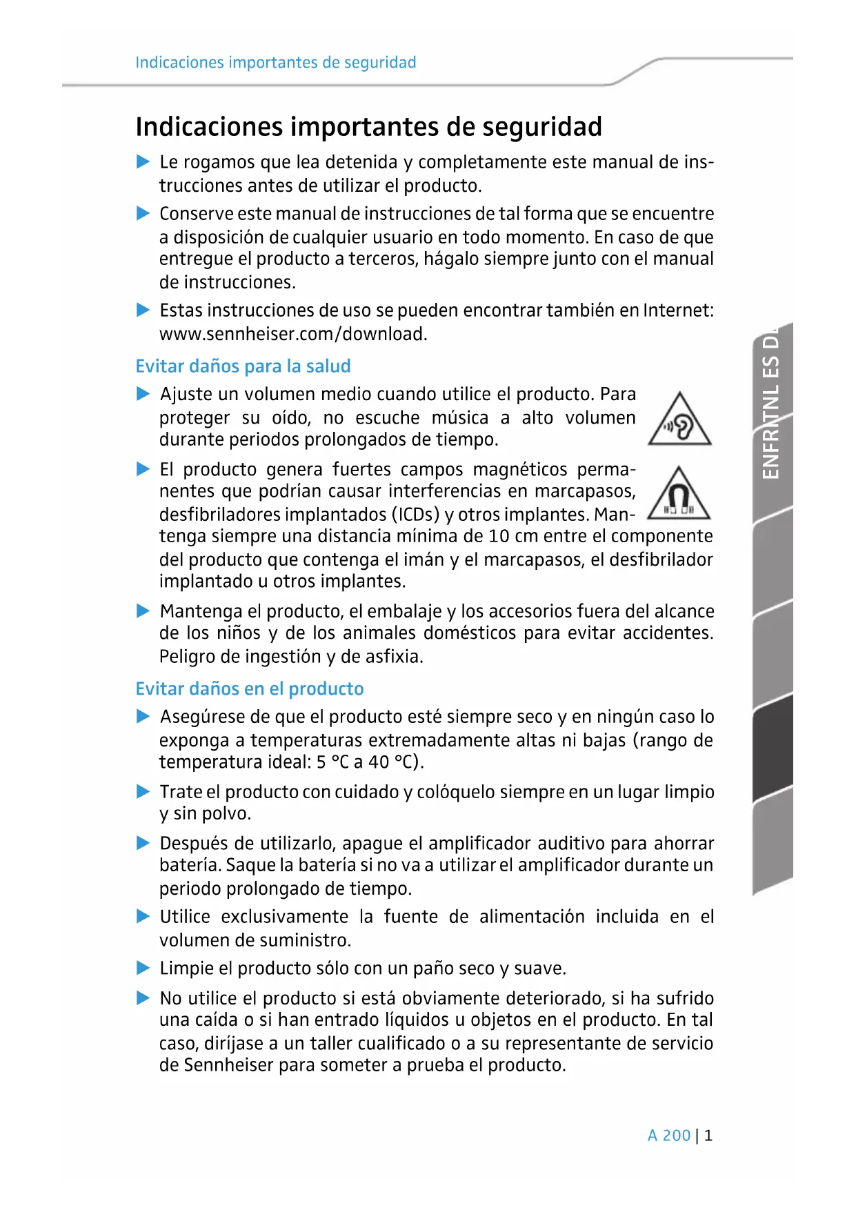 Indicaciones importantes de seguridad 왘 Le rogamos que lea detenida y completamente este manual de ins- trucciones antes de utilizar el producto. 왘 Conserve este manual de instrucciones de tal forma que se encuentre a disposición de cualquier usuario en todo momento. En caso de que entregue el producto a terceros, hágalo siempre junto con el manual de instrucciones. 왘 Estas instrucciones de uso se pueden encontrar también en Internet: www.sennheiser.com/download. Evitar daños para la salud 왘 Ajuste un volumen medio cuando utilice el producto. Para proteger su oído, no escuche música a alto volumen durante periodos prolongados de tiempo. 왘 El producto genera fuertes campos magnéticos perma- nentes que podrían causar interferencias en marcapasos, desfibriladores implantados (ICDs) y otros implantes. Man- tenga siempre una distancia mínima de 10 cm entre el componente del producto que contenga el imán y el marcapasos, el desfibrilador implantado u otros implantes. 왘 Mantenga el producto, el embalaje y los accesorios fuera del alcance de los niños y de los animales domésticos para evitar accidentes. Peligro de ingestión y de asfixia. Evitar daños en el producto 왘 Asegúrese de que el producto esté siempre seco y en ningún caso lo exponga a temperaturas extremadamente altas ni bajas (rango de temperatura ideal: 5 °C a 40 °C). 왘 Trate el producto con cuidado y colóquelo siempre en un lugar limpio y sin polvo. 왘 Después de utilizarlo, apague el amplificador auditivo para ahorrar batería. Saque la batería si no va a utilizar el amplificador durante un periodo prolongado de tiempo. 왘 Utilice exclusivamente la fuente de alimentación incluida en el volumen de suministro. 왘 Limpie el producto sólo con un paño seco y suave. 왘 No utilice el producto si está obviamente deteriorado, si ha sufrido una caída o si han entrado líquidos u objetos en el producto. En tal caso, diríjase a un taller cualificado o a su representante de servicio de Sennheiser para someter a prueba el producto.Indicaciones importantes de seguridad 2 | A 200 왘 Utilice exclusivamente complementos/accesorios/piezas de repuesto suministradas o recomendadas por Sennheiser. Evitar daños en la fuente de alimentación 왘 Evite la humedad en la fuente de alimentación. Existe peligro de incendio o de descarga eléctrica. 왘 Desconecte la fuente de alimentación del enchufe para desconectar el producto de la red eléctrica cuando se presenten tormentas o no se vaya a utilizar el producto durante un periodo prolongado. 왘 Opere la fuente de alimentación únicamente con los tipos de tomas de corriente indicados en las Especificaciones técnicas (consulte la página 9). 왘 Asegúrese siempre de que la fuente de alimentación esté en un buen estado, fácilmente accesible, bien enchufada en la toma de corriente, de que no esté cubierta ni sea expuesta prolongadamente a la radia- ción solar para evitar un sobrecalentamiento. Uso adecuado Este producto se ha destinado para el uso privado en el ámbito domés- tico. Se ha concebido el amplificador exclusivamente para favorecer su audición de forma ocasional. Se considera uso no adecuado si el producto