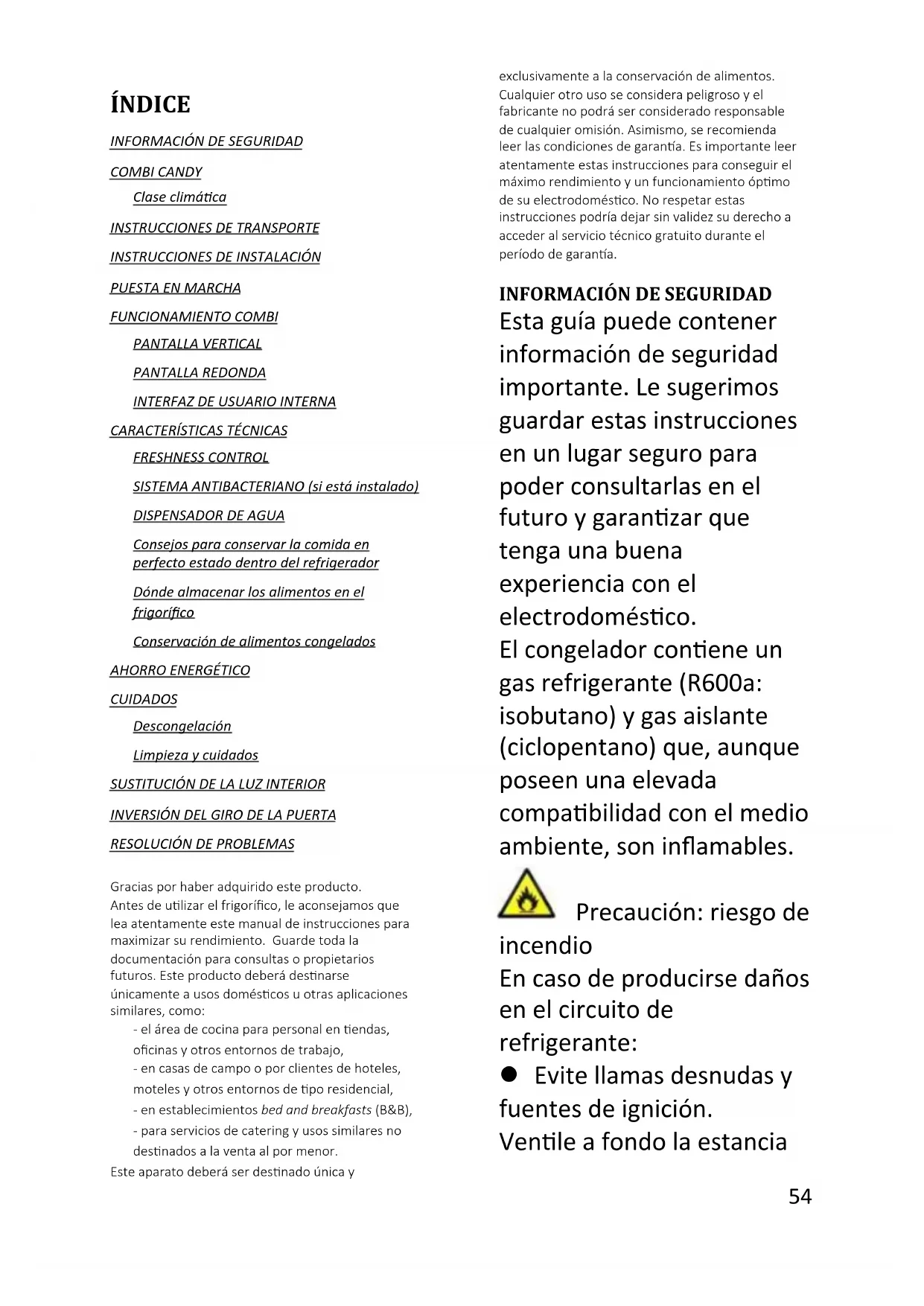 Les thermostats, les capteurs de température, les cartes de circuit imprimé et les sources lumineuses sont disponibles pour une période minimale de sept ans à compter de la mise sur le marché de la dernière unité du modèle; Les poignées de porte, gonds de porte, plateaux et bacs, sont disponibles pour une période minimale de sept ans, et les joints de porte sont disponibles pour une période minimale de 10 ans à compter de la mise sur le marché de la dernière unité du modèle; Pour plus d'informations sur le produit, veuillez consulter https://eprel.ec.europa.eu/ ou scannez le QR sur l'étiquette énergétique fournie avec l'appareil54 Español ÍNDICE INFORMACIÓN DE SEGURIDAD COMBI CANDY Clase climática INSTRUCCIONES DE TRANSPORTE INSTRUCCIONES DE INSTALACIÓN PUESTA EN MARCHA FUNCIONAMIENTO COMBI PANTALLA VERTICAL PANTALLA REDONDA INTERFAZ DE USUARIO INTERNA CARACTERÍSTICAS TÉCNICAS FRESHNESS CONTROL SISTEMA ANTIBACTERIANO (si está instalado) DISPENSADOR DE AGUA Consejos para conservar la comida en perfecto estado dentro del refrigerador Dónde almacenar los alimentos en el frigorífico Conservación de alimentos congelados AHORRO ENERGÉTICO CUIDADOS Descongelación Limpieza y cuidados SUSTITUCIÓN DE LA LUZ INTERIOR INVERSIÓN DEL GIRO DE LA PUERTA RESOLUCIÓN DE PROBLEMAS Gracias por haber adquirido este producto. Antes de utilizar el frigorífico, le aconsejamos que lea atentamente este manual de instrucciones para maximizar su rendimiento. Guarde toda la documentación para consultas o propietarios futuros. Este producto deberá destinarse únicamente a usos domésticos u otras aplicaciones similares, como: - el área de cocina para personal en tiendas, oficinas y otros entornos de trabajo, - en casas de campo o por clientes de hoteles, moteles y otros entornos de tipo residencial, - en establecimientos bed and breakfasts (B&B), - para servicios de catering y usos similares no destinados a la venta al por menor. Este aparato deberá ser destinado única y exclusivamente a la conservación de alimentos. Cualquier otro uso se considera peligroso y el fabricante no podrá ser considerado responsable de cualquier omisión. Asimismo, se recomienda leer las condiciones de garantía. Es importante leer atentamente estas instrucciones para conseguir el máximo rendimiento y un funcionamiento óptimo de su electrodoméstico. No respetar estas instrucciones podría dejar sin validez su derecho a acceder al servicio técnico gratuito durante el período de garantía.