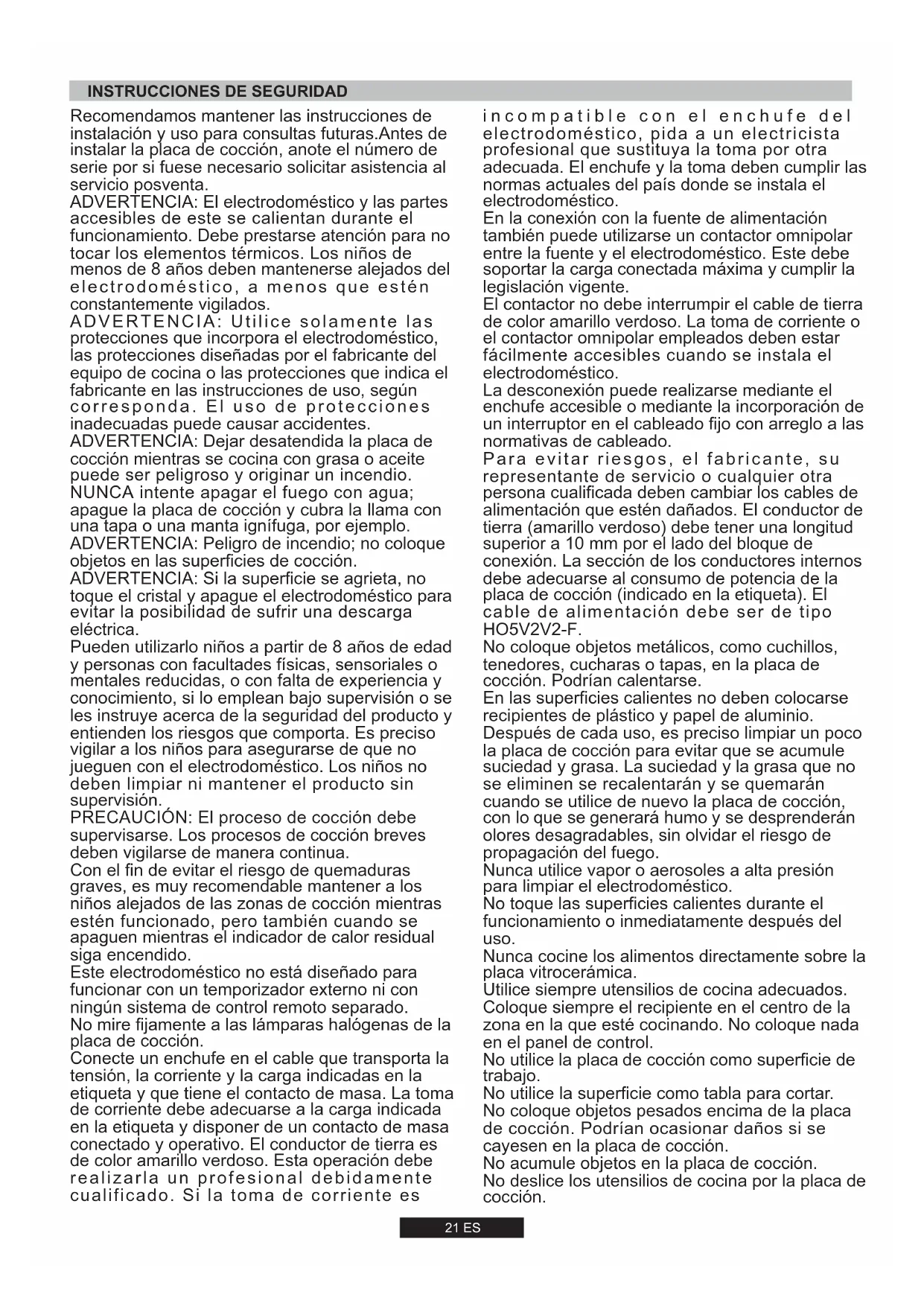 UR 3,5 kW21 ES Recomendamos mantener las instrucciones de instalación y uso para consultas futuras.Antes de instalar la placa de cocción, anote el número de serie por si fuese necesario solicitar asistencia al servicio posventa. ADVERTENCIA: El electrodoméstico y las partes accesibles de este se calientan durante el funcionamiento. Debe prestarse atención para no tocar los elementos térmicos. Los niños de menos de 8 años deben mantenerse alejados del electrodoméstico, a menos que estén constantemente vigilados. ADVERTENCIA: Utilice solamente las protecciones que incorpora el electrodoméstico, las protecciones diseñadas por el fabricante del equipo de cocina o las protecciones que indica el fabricante en las instrucciones de uso, según corresponda. El uso de protecciones inadecuadas puede causar accidentes. ADVERTENCIA: Dejar desatendida la placa de cocción mientras se cocina con grasa o aceite puede ser peligroso y originar un incendio. NUNCA intente apagar el fuego con agua; apague la placa de cocción y cubra la llama con una tapa o una manta ignífuga, por ejemplo. ADVERTENCIA: Peligro de incendio; no coloque objetos en las superficies de cocción. ADVERTENCIA: Si la superficie se agrieta, no toque el cristal y apague el electrodoméstico para evitar la posibilidad de sufrir una descarga eléctrica. Pueden utilizarlo niños a partir de 8 años de edad y personas con facultades físicas, sensoriales o mentales reducidas, o con falta de experiencia y conocimiento, si lo emplean bajo supervisión o se les instruye acerca de la seguridad del producto y entienden los riesgos que comporta. Es preciso vigilar a los niños para asegurarse de que no jueguen con el electrodoméstico. Los niños no deben limpiar ni mantener el producto sin supervisión. PRECAUCIÓN: El proceso de cocción debe supervisarse. Los procesos de cocción breves deben vigilarse de manera continua. Con el fin de evitar el riesgo de quemaduras graves, es muy recomendable mantener a los niños alejados de las zonas de cocción mientras estén funcionado, pero también cuando se apaguen mientras el indicador de calor residual siga encendido. Este electrodoméstico no está diseñado para funcionar con un temporizador externo ni con ningún sistema de control remoto separado. No mire fijamente a las lámparas halógenas de la placa de cocción. Conecte un enchufe en el cable que transporta la tensión, la corriente y la carga indicadas en la etiqueta y que tiene el contacto de masa. La toma de corriente debe adecuarse a la carga indicada en la etiqueta y disponer de un contacto de masa conectado y operativo. El conductor de tierra es de color amarillo verdoso. Esta operación debe realizarla un profesional debidamente cualificado. Si la toma de corriente es