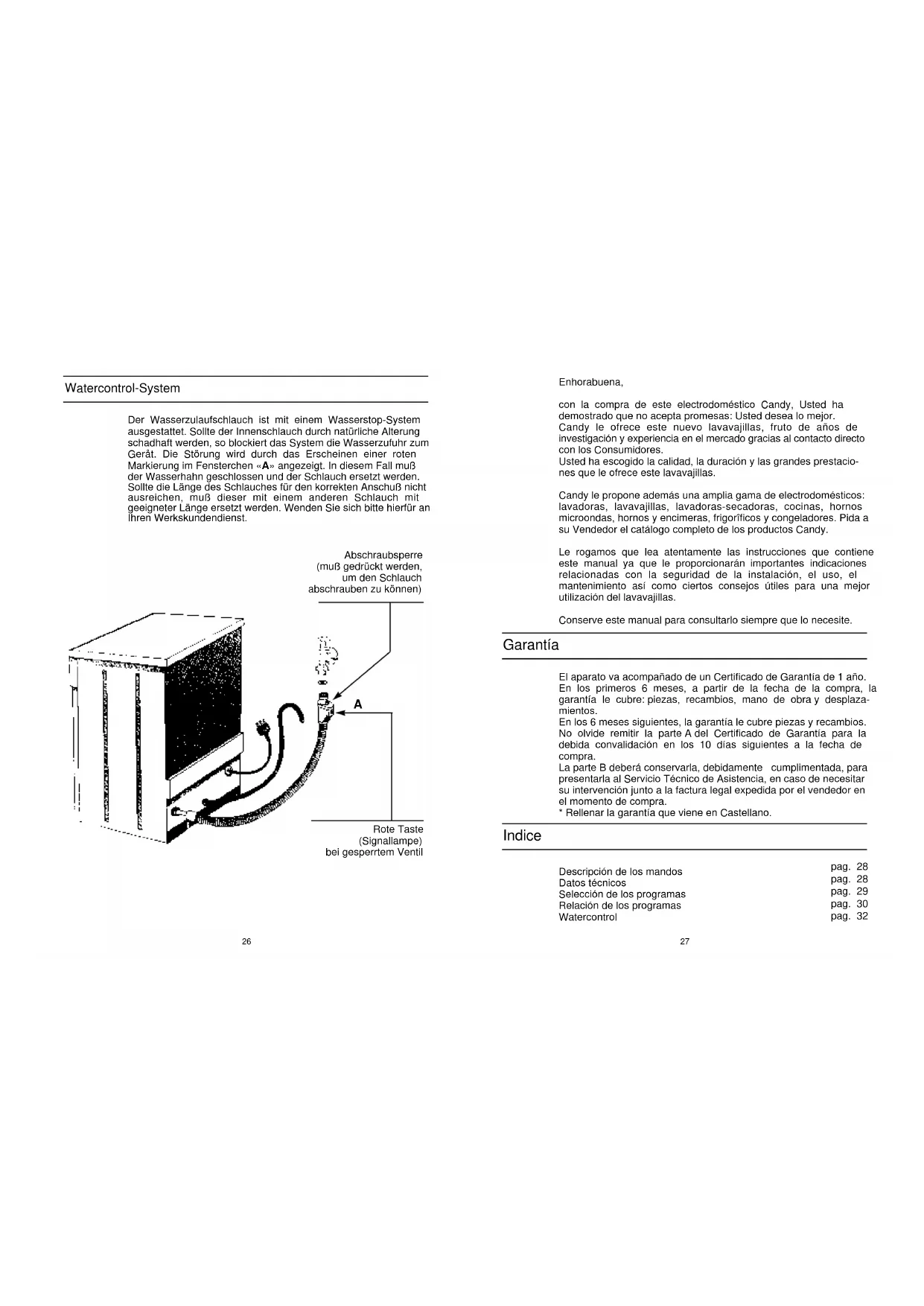 - •••• •• ••••2726 Enhorabuena, con la compra de este electrodoméstico Candy, Usted ha demostrado que no acepta promesas: Usted desea lo mejor. Candy le ofrece este nuevo lavavajillas, fruto de años de investigación y experiencia en el mercado gracias al contacto directo con los Consumidores. Usted ha escogido la calidad, la duración y las grandes prestacio- nes que le ofrece este lavavajillas. Candy le propone además una amplia gama de electrodomésticos: lavadoras, lavavajillas, lavadoras-secadoras, cocinas, hornos microondas, hornos y encimeras, frigorîficos y congeladores. Pida a su Vendedor el catálogo completo de los productos Candy. Le rogamos que lea atentamente las instrucciones que contiene este manual ya que le proporcionarán importantes indicaciones relacionadas con la seguridad de la instalación, el uso, el mantenimiento así como ciertos consejos útiles para una mejor utilización del lavavajillas. Conserve este manual para consultarlo siempre que lo necesite. El aparato va acompañado de un Certificado de Garantía de 1 año. En los primeros 6 meses, a partir de la fecha de la compra, la garantía le cubre: piezas, recambios, mano de obra y desplaza- mientos. En los 6 meses siguientes, la garantía le cubre piezas y recambios. No olvide remitir la parte A del Certificado de Garantía para la debida convalidación en los 10 días siguientes a la fecha de compra. La parte B deberá conservarla, debidamente cumplimentada, para presentarla al Servicio Técnico de Asistencia, en caso de necesitar su intervención junto a la factura legal expedida por el vendedor en el momento de compra.