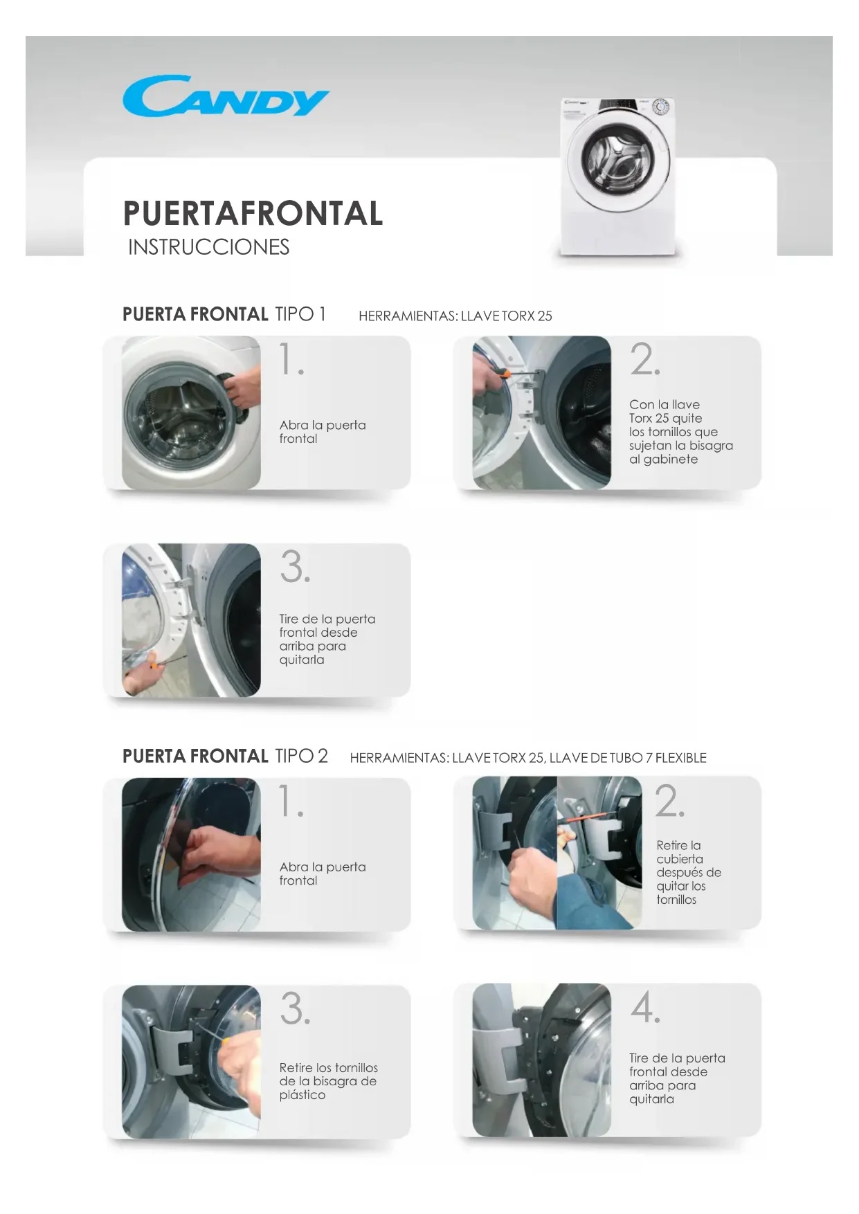 PUERTA FRONTAL TIPO 2 HERRAMIENTAS: LLAVE TORX 25, LLAVE DE TUBO 7 FLEXIBLE PUERTA FRONTAL INSTRUCCIONES1. Abra la puerta frontalRetire la cubierta después de quitar los tornillos Retire los tornillos de la bisagra de plástico Tire de la puerta frontal desde arriba para quitarla