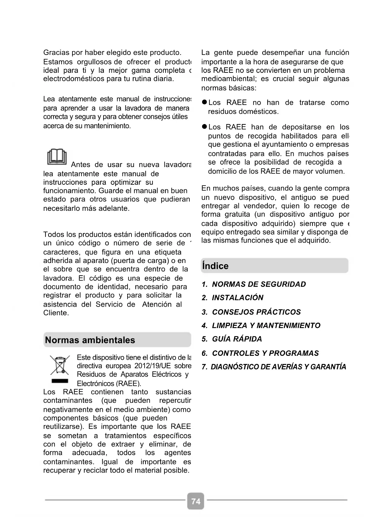 Gracias por haber elegido este producto. Estamos orgullosos de ofrecer el producto ideal para ti y la mejor gama completa de electrodomésticos para tu rutina diaria. Lea atentamente este manual de instrucciones para aprender a usar la lavadora de manera correcta y segura y para obtener consejos útiles acerca de su mantenimiento. Antes de usar su nueva lavadora, lea atentamente este manual de instrucciones para optimizar su funcionamiento. Guarde el manual en buen estado para otros usuarios que pudieran necesitarlo más adelante. Todos los productos están identificados con un único código o número de serie de 16 caracteres, que figura en una etiqueta adherida al aparato (puerta de carga) o en el sobre que se encuentra dentro de la lavadora. El código es una especie de documento de identidad, necesario para registrar el producto y para solicitar la asistencia del Servicio de Atención al Cliente.