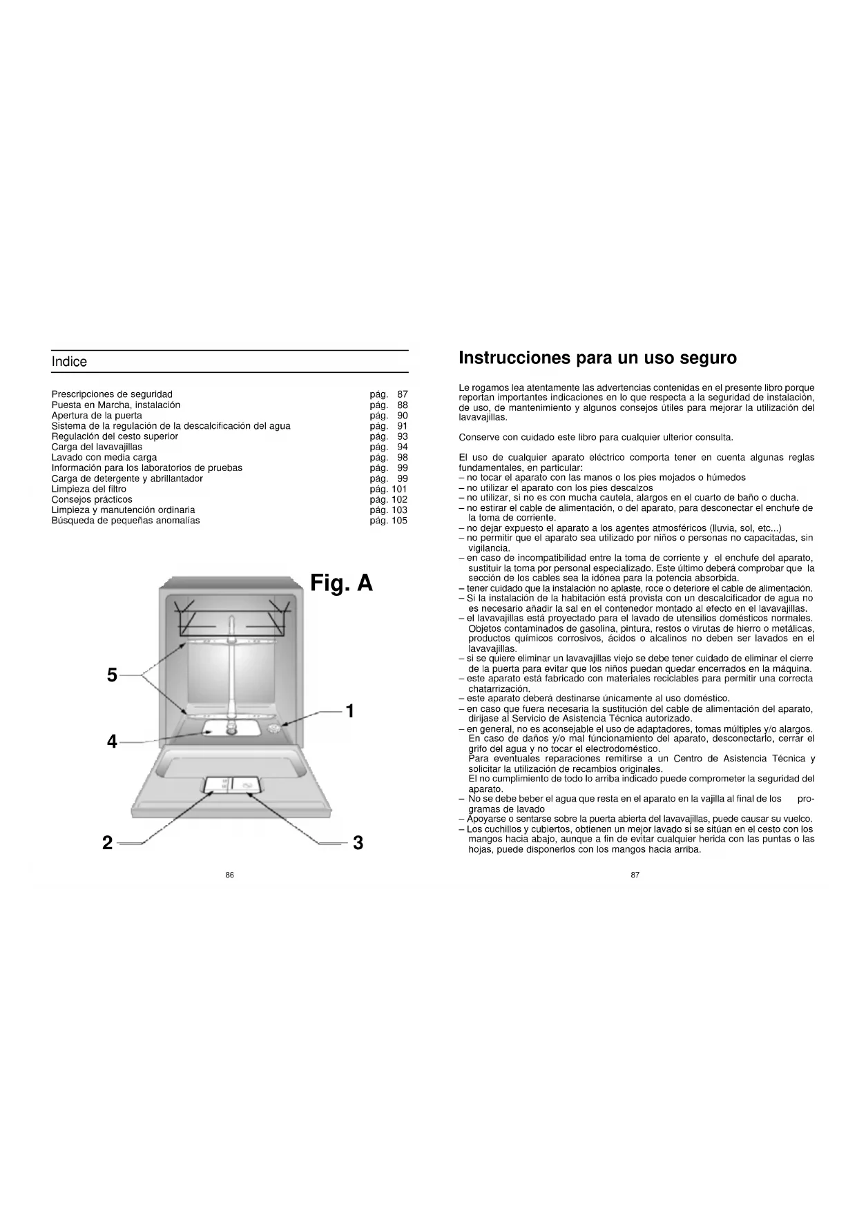 Indice Prescripciones de seguridad Puesta en Marcha, instalación Apertura de la puerta Sistema de la regulación de la descalcificación del agua Regulación del cesto superior Carga del lavavajillas Lavado con media carga Información para los laboratorios de pruebas Carga de detergente y abrillantador Limpieza del filtro Consejos prácticos Limpieza y manutención ordinaria Búsqueda de pequeñas anomalías pág. 87 pág. 88 pág. 90 pág. 91 pág. 93 pág. 94 pág. 98 pág. 99 pág. 99 pág. 101 pág. 102 pág. 103 pág. 105