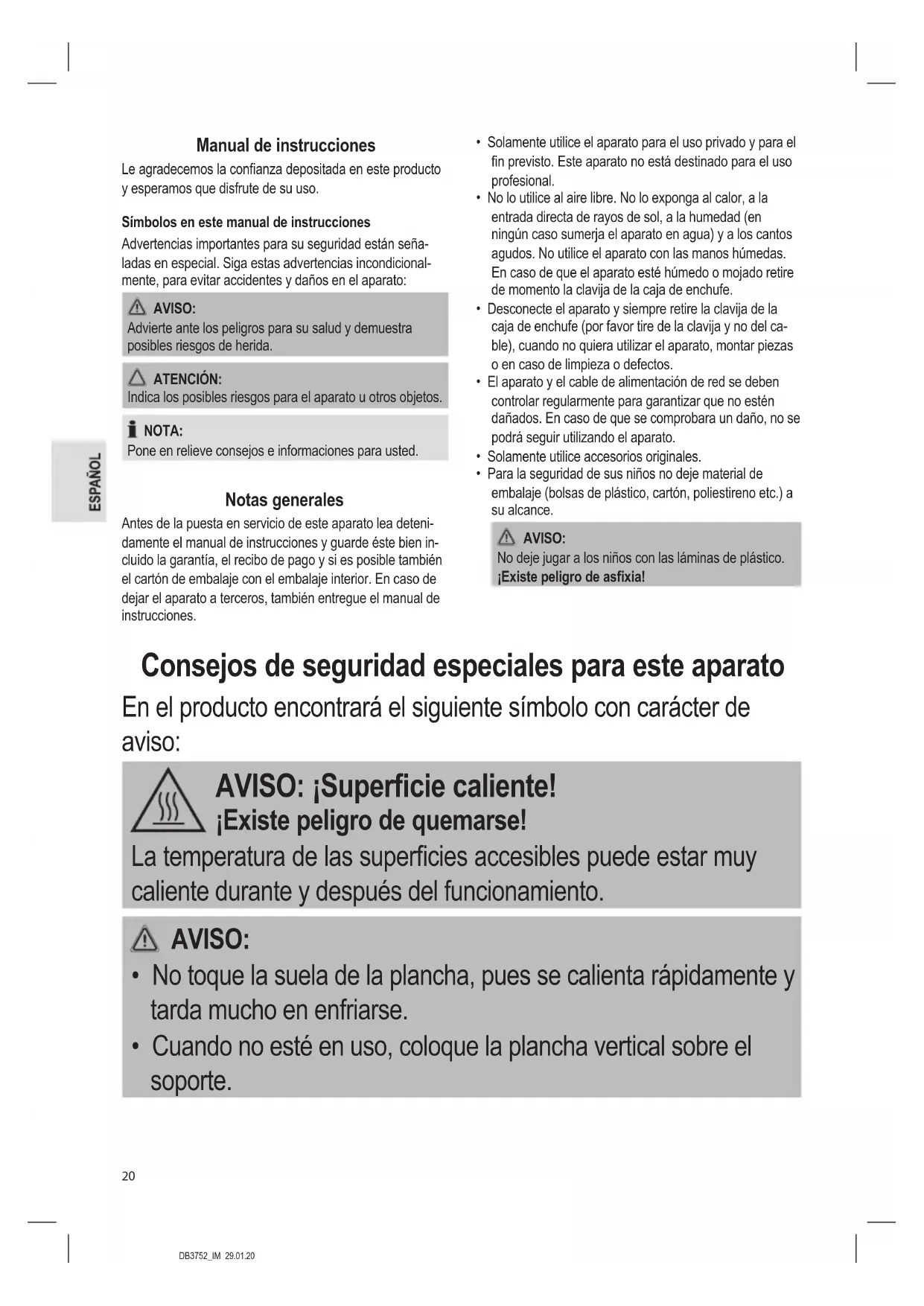 - Este aparato no está diseñado para sumergirlo en agua durante su limpieza. Siga las instrucciones que hemos incluido en el capítulo “Limpieza”.DB3752_IM 29.01.20