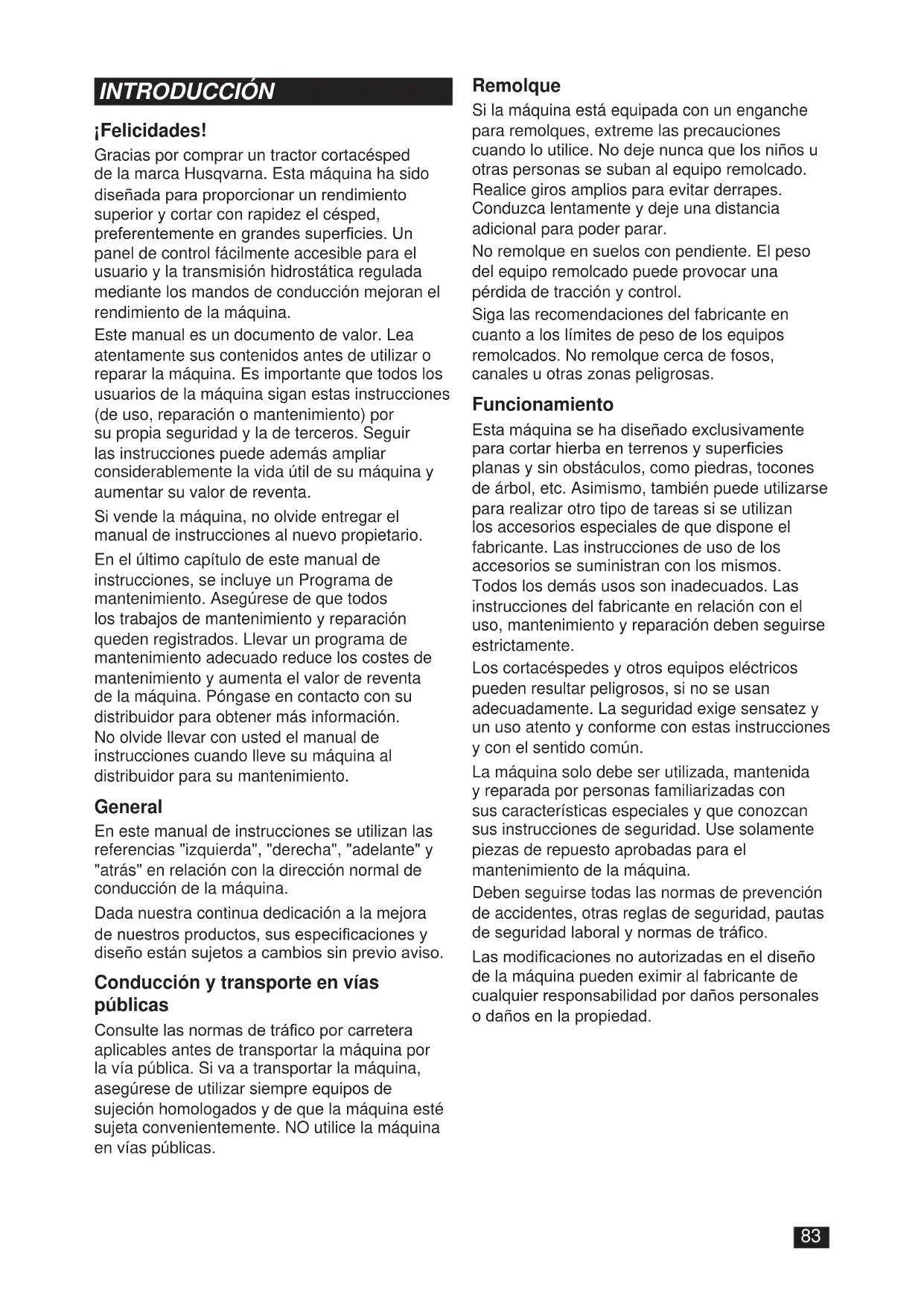 PROGRAMA DE MANTENIMIENTO ..........118¡Felicidades! Gracias por comprar un tractor cortacésped de la marca Husqvarna. Esta máquina ha sido diseñada para proporcionar un rendimiento superior y cortar con rapidez el césped, preferentemente en grandes supercies. Un panel de control fácilmente accesible para el usuario y la transmisión hidrostática regulada mediante los mandos de conducción mejoran el rendimiento de la máquina. Este manual es un documento de valor. Lea atentamente sus contenidos antes de utilizar o reparar la máquina. Es importante que todos los usuarios de la máquina sigan estas instrucciones (de uso, reparación o mantenimiento) por su propia seguridad y la de terceros. Seguir las instrucciones puede además ampliar considerablemente la vida útil de su máquina y aumentar su valor de reventa. Si vende la máquina, no olvide entregar el manual de instrucciones al nuevo propietario. En el último capítulo de este manual de instrucciones, se incluye un Programa de mantenimiento. Asegúrese de que todos los trabajos de mantenimiento y reparación queden registrados. Llevar un programa de mantenimiento adecuado reduce los costes de mantenimiento y aumenta el valor de reventa de la máquina. Póngase en contacto con su distribuidor para obtener más información. No olvide llevar con usted el manual de instrucciones cuando lleve su máquina al distribuidor para su mantenimiento. General En este manual de instrucciones se utilizan las referencias "izquierda", "derecha", "adelante" y "atrás" en relación con la dirección normal de conducción de la máquina. Dada nuestra continua dedicación a la mejora de nuestros productos, sus especicaciones y diseño están sujetos a cambios sin previo aviso. Conducción y transporte en vías públicas Consulte las normas de tráco por carretera aplicables antes de transportar la máquina por la vía pública. Si va a transportar la máquina, asegúrese de utilizar siempre equipos de sujeción homologados y de que la máquina esté sujeta convenientemente. NO utilice la máquina en vías públicas. Remolque Si la máquina está equipada con un enganche para remolques, extreme las precauciones cuando lo utilice. No deje nunca que los niños u otras personas se suban al equipo remolcado. Realice giros amplios para evitar derrapes. Conduzca lentamente y deje una distancia adicional para poder parar. No remolque en suelos con pendiente. El peso del equipo remolcado puede provocar una pérdida de tracción y control. Siga las recomendaciones del fabricante en cuanto a los límites de peso de los equipos remolcados. No remolque cerca de fosos, canales u otras zonas peligrosas. Funcionamiento Esta máquina se ha diseñado exclusivamente para cortar hierba en terrenos y supercies planas y sin obstáculos, como piedras, tocones de árbol, etc. Asimismo, también puede utilizarse para realizar otro tipo de tareas si se utilizan los accesorios especiales de que dispone el fabricante. Las instrucciones de uso de los accesorios se suministran con los mismos. Todos los demás usos son inadecuados. Las instrucciones del fabricante en relación con el uso, mantenimiento y reparación deben seguirse estrictamente. Los cortacéspedes y otros equipos eléctricos pueden resultar peligrosos, si no se usan adecuadamente. La seguridad exige sensatez y un uso atento y conforme con estas instrucciones y con el sentido común. La máquina solo debe ser utilizada, mantenida y reparada por personas familiarizadas con sus características especiales y que conozcan sus instrucciones de seguridad. Use solamente piezas de repuesto aprobadas para el mantenimiento de la máquina. Deben seguirse todas las normas de prevención de accidentes, otras reglas de seguridad, pautas de seguridad laboral y normas de tráco. Las modicaciones no autorizadas en el diseño de la máquina pueden eximir al fabricante de cualquier responsabilidad por daños personales o daños en la propiedad.