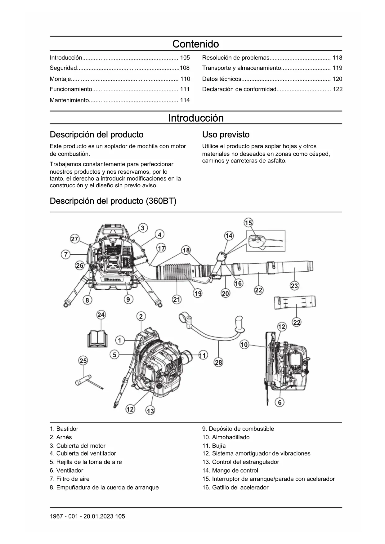 - Declaración de conformidad Introducción Descripción del producto Este producto es un soplador de mochila con motor de combustión. Trabajamos constantemente para perfeccionar nuestros productos y nos reservamos, por lo tanto, el derecho a introducir modificaciones en la construcción y el diseño sin previo aviso. Uso previsto Utilice el producto para soplar hojas y otros materiales no deseados en zonas como césped, caminos y carreteras de asfalto. Descripción del producto (360BT) p. 122