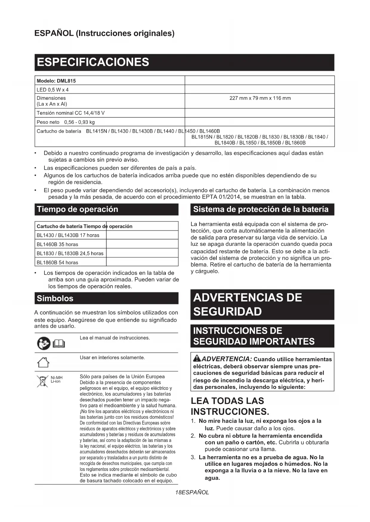 - Lostiemposdeoperaciónindicadosenlatablade arribasonunaguíaaproximada.Puedenvariarde los tiempos de operación reales. Símbolos Acontinuaciónsemuestranlossímbolosutilizadoscon esteequipo.Asegúresedequeentiendesusignicado antes de usarlo. Lea el manual de instrucciones.Usar en interiores solamente. Ni-MH Li-ionSóloparapaísesdelaUniónEuropeaDebidoalapresenciadecomponentespeligrososenelequipo,elequipoeléctricoyelectrónico,losacumuladoresylasbateríasdesechados pueden tener un impacto nega-tivoparaelmedioambienteylasaludhumana.¡No tire los aparatos eléctricos y electrónicos ni lasbateríasjuntoconlosresiduosdomésticos!DeconformidadconlasDirectivasEuropeassobreresiduosdeaparatoseléctricosyelectrónicosysobreacumuladoresybateríasyresiduosdeacumuladoresybaterías,asícomolaadaptacióndelasmismasalaleynacional,elequipoeléctrico,lasbateríasylosacumuladoresdesechadosdeberánseralmacenadospor separado y trasladados a un punto distinto de recogidadedesechosmunicipales,quecumplaconlosreglamentossobreprotecciónmedioambiental.Estoseindicamedianteelsímbolodecubodebasuratachadocolocadoenelequipo. Sistema de protección de la batería Laherramientaestáequipadaconelsistemadepro- tección,quecortaautomáticamentelaalimentación de salida para preservar su larga vida de servicio. La luzseapagadurantelaoperacióncuandoquedapoca capacidadrestantedebatería.Estosedebealaacti- vacióndelsistemadeprotecciónynosignicaunpro- blema.Retireelcartuchodebateríadelaherramienta ycárguelo. ADVERTENCIAS DE SEGURIDAD INSTRUCCIONES DE SEGURIDAD IMPORTANTES ADVERTENCIA: Cuando utilice herramientas eléctricas, deberá observar siempre unas pre- cauciones de seguridad básicas para reducir el riesgo de incendio la descarga eléctrica, y heri- das personales, incluyendo lo siguiente: