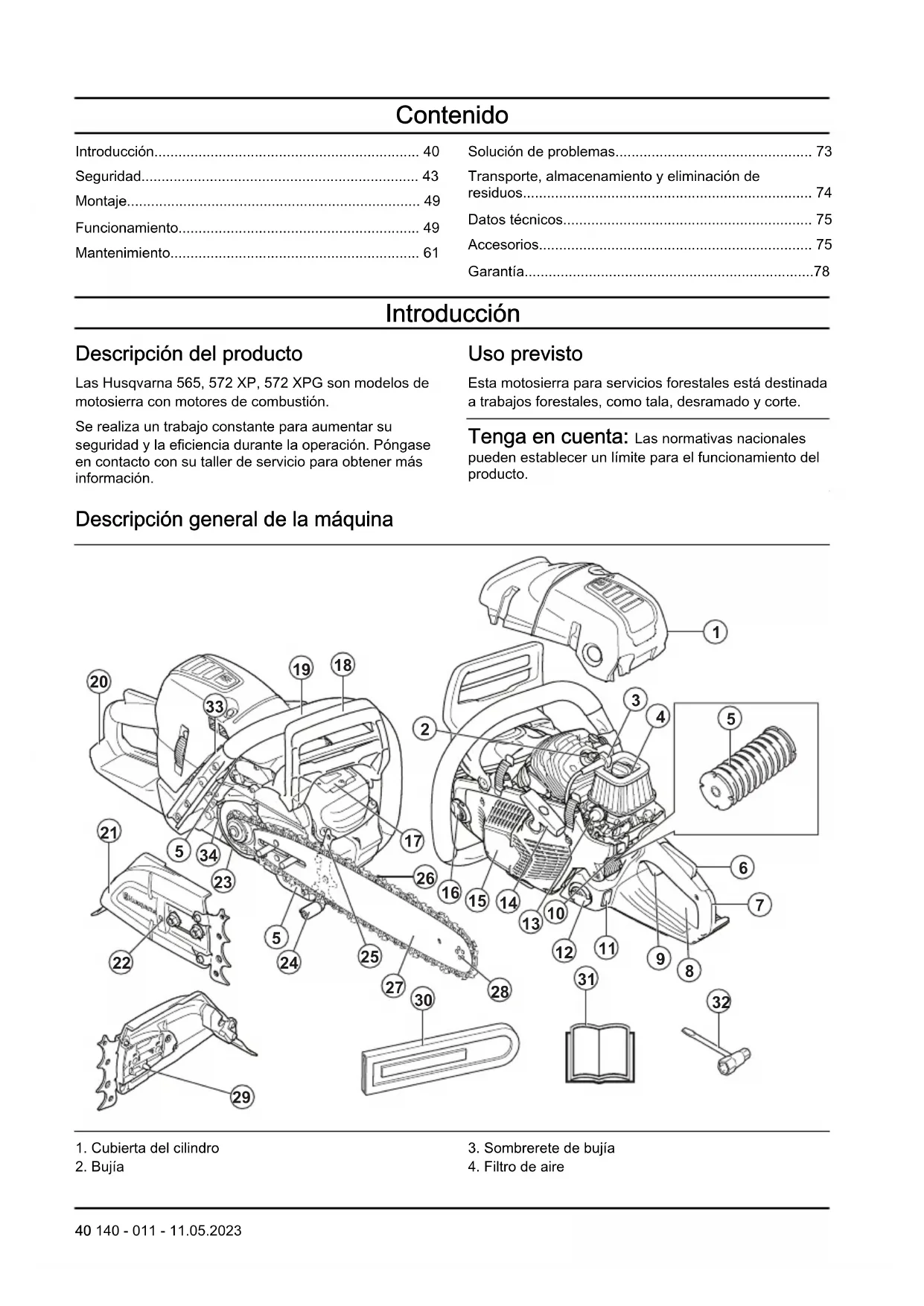 - Garantía Introducción Descripción del producto Las Husqvarna 565, 572 XP, 572 XPG son modelos de motosierra con motores de combustión. Se realiza un trabajo constante para aumentar su seguridad y la eficiencia durante la operación. Póngase en contacto con su taller de servicio para obtener más información. Uso previsto Esta motosierra para servicios forestales está destinada a trabajos forestales, como tala, desramado y corte. Tenga en cuenta: Las normativas nacionales pueden establecer un límite para el funcionamiento del producto. Descripción general de la máquina p. 78