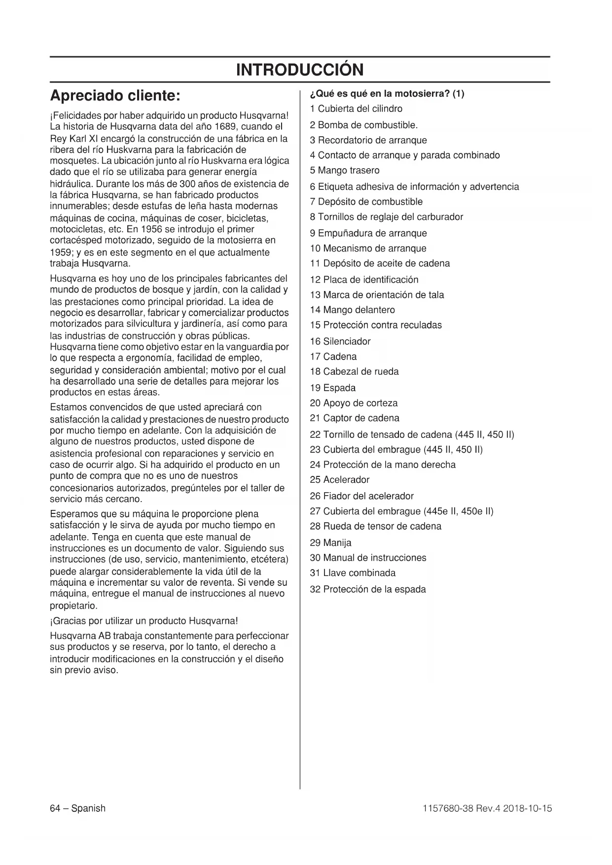 - Declaración CE de conformidad INTRODUCCIÓN 64 – Spanish 1157680-38 Rev.4 2018-10-15 Apreciado cliente: ¡Felicidades por haber adquirido un producto Husqvarna! La historia de Husqvarna data del año 1689, cuando el Rey Karl XI encargó la construcción de una fábrica en la ribera del río Huskvarna para la fabricación de mosquetes. La ubicación junto al río Huskvarna era lógica dado que el río se utilizaba para generar energía hidráulica. Durante los más de 300 años de existencia de la fábrica Husqvarna, se han fabricado productos innumerables; desde estufas de leña hasta modernas máquinas de cocina, máquinas de coser, bicicletas, motocicletas, etc. En 1956 se introdujo el primer cortacésped motorizado, seguido de la motosierra en 1959; y es en este segmento en el que actualmente trabaja Husqvarna. Husqvarna es hoy uno de los principales fabricantes del mundo de productos de bosque y jardín, con la calidad y las prestaciones como principal prioridad. La idea de negocio es desarrollar, fabricar y comercializar productos motorizados para silvicultura y jardinería, así como para las industrias de construcción y obras públicas. Husqvarna tiene como objetivo estar en la vanguardia por lo que respecta a ergonomía, facilidad de empleo, seguridad y consideración ambiental; motivo por el cual ha desarrollado una serie de detalles para mejorar los productos en estas áreas. Estamos convencidos de que usted apreciará con satisfacción la calidad y prestaciones de nuestro producto por mucho tiempo en adelante. Con la adquisición de alguno de nuestros productos, usted dispone de asistencia profesional con reparaciones y servicio en caso de ocurrir algo. Si ha adquirido el producto en un punto de compra que no es uno de nuestros concesionarios autorizados, pregúnteles por el taller de servicio más cercano. Esperamos que su máquina le proporcione plena satisfacción y le sirva de ayuda por mucho tiempo en adelante. Tenga en cuenta que este manual de instrucciones es un documento de valor. Siguiendo sus instrucciones (de uso, servicio, mantenimiento, etcétera) puede alargar considerablemente la vida útil de la máquina e incrementar su valor de reventa. Si vende su máquina, entregue el manual de instrucciones al nuevo propietario. ¡Gracias por utilizar un producto Husqvarna! Husqvarna AB trabaja constantemente para perfeccionar sus productos y se reserva, por lo tanto, el derecho a introducir modificaciones en la construcción y el diseño sin previo aviso. ¿Qué es qué en la motosierra? (1) 1 Cubierta del cilindro 2 Bomba de combustible. 3 Recordatorio de arranque 4 Contacto de arranque y parada combinado 5 Mango trasero 6 Etiqueta adhesiva de información y advertencia 7 Depósito de combustible 8 Tornillos de reglaje del carburador 9 Empuñadura de arranque 10 Mecanismo de arranque 11 Depósito de aceite de cadena 12 Placa de identificación 13 Marca de orientación de tala 14 Mango delantero 15 Protección contra reculadas 16 Silenciador 17 Cadena 18 Cabezal de rueda 19 Espada 20 Apoyo de corteza 21 Captor de cadena 22 Tornillo de tensado de cadena (445 II, 450 II) 23 Cubierta del embrague (445 II, 450 II) 24 Protección de la mano derecha 25 Acelerador 26 Fiador del acelerador 27 Cubierta del embrague (445e II, 450e II) 28 Rueda de tensor de cadena 29 Manija 30 Manual de instrucciones 31 Llave combinada 32 Protección de la espadaINSTRUCCIONES GENERALES DE SEGURIDAD Spanish – 65 1157680-38 Rev.4 2018-10-15 Medidas a tomar antes de utilizar una motosierra nueva p. 90