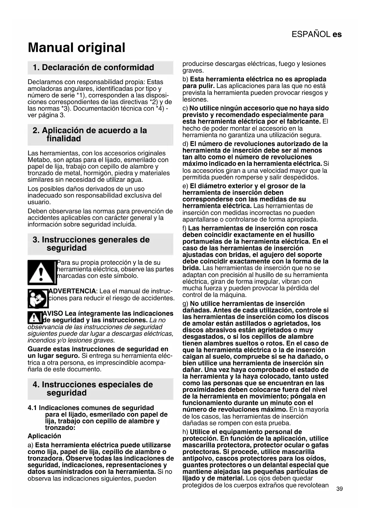 Manual original Declaramos con responsabilidad propia: Estas amoladoras angulares, identificadas por tipo y número de serie *1), corresponden a las disposi- ciones correspondientes de las directivas *2) y de las normas *3). Documentación técnica con *4) - ver página 3. Las herramientas, con los accesorios originales Metabo, son aptas para el lijado, esmerilado con papel de lija, trabajo con cepillo de alambre y tronzado de metal, hormigón, piedra y materiales similares sin necesidad de utilizar agua. Los posibles daños derivados de un uso inadecuado son responsabilidad exclusiva del usuario. Deben observarse las normas para prevención de accidentes aplicables con carácter general y la información sobre seguridad incluida. Para su propia protección y la de su herramienta eléctrica, observe las partes marcadas con este símbolo. ADVERTENCIA: Lea el manual de instruc- ciones para reducir el riesgo de accidentes. AVISO Lea íntegramente las indicaciones de seguridad y las instrucciones. La no observancia de las instrucciones de seguridad siguientes puede dar lugar a descargas eléctricas, incendios y/o lesiones graves. Guarde estas instrucciones de seguridad en un lugar seguro. Si entrega su herramienta eléc- trica a otra persona, es imprescindible acompa- ñarla de este documento.