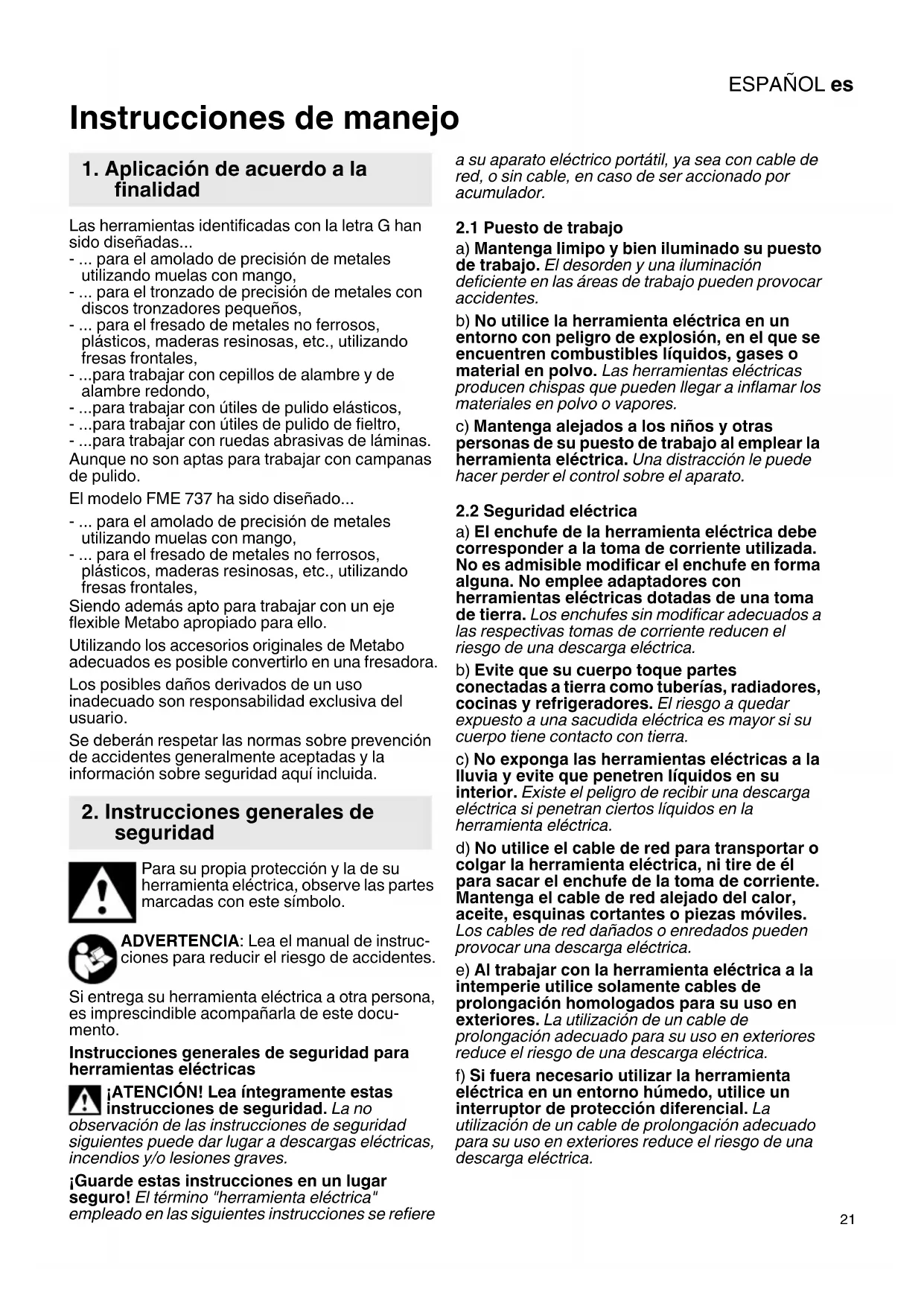 Instrucciones de manejo Las herramientas identificadas con la letra G han sido diseñadas... - ... para el amolado de precisión de metales utilizando muelas con mango, - ... para el tronzado de precisión de metales con discos tronzadores pequeños, - ... para el fresado de metales no ferrosos, plásticos, maderas resinosas, etc., utilizando fresas frontales, - ...para trabajar con cepillos de alambre y de alambre redondo, - ...para trabajar con útiles de pulido elásticos, - ...para trabajar con útiles de pulido de fieltro, - ...para trabajar con ruedas abrasivas de láminas. Aunque no son aptas para trabajar con campanas de pulido. El modelo FME 737 ha sido diseñado... - ... para el amolado de precisión de metales utilizando muelas con mango, - ... para el fresado de metales no ferrosos, plásticos, maderas resinosas, etc., utilizando fresas frontales, Siendo además apto para trabajar con un eje flexible Metabo apropiado para ello. Utilizando los accesorios originales de Metabo adecuados es posible convertirlo en una fresadora. Los posibles daños derivados de un uso inadecuado son responsabilidad exclusiva del usuario. Se deberán respetar las normas sobre prevención de accidentes generalmente aceptadas y la información sobre seguridad aquí incluida. Para su propia protección y la de su herramienta eléctrica, observe las partes marcadas con este símbolo. ADVERTENCIA: Lea el manual de instruc- ciones para reducir el riesgo de accidentes. Si entrega su herramienta eléctrica a otra persona, es imprescindible acompañarla de este docu- mento. Instrucciones generales de seguridad para herramientas eléctricas ¡ATENCIÓN! Lea íntegramente estas instrucciones de seguridad. La no observación de las instrucciones de seguridad siguientes puede dar lugar a descargas eléctricas, incendios y/o lesiones graves. ¡Guarde estas instrucciones en un lugar seguro! El término "herramienta eléctrica" empleado en las siguientes instrucciones se refiere a su aparato eléctrico portátil, ya sea con cable de red, o sin cable, en caso de ser accionado por acumulador.