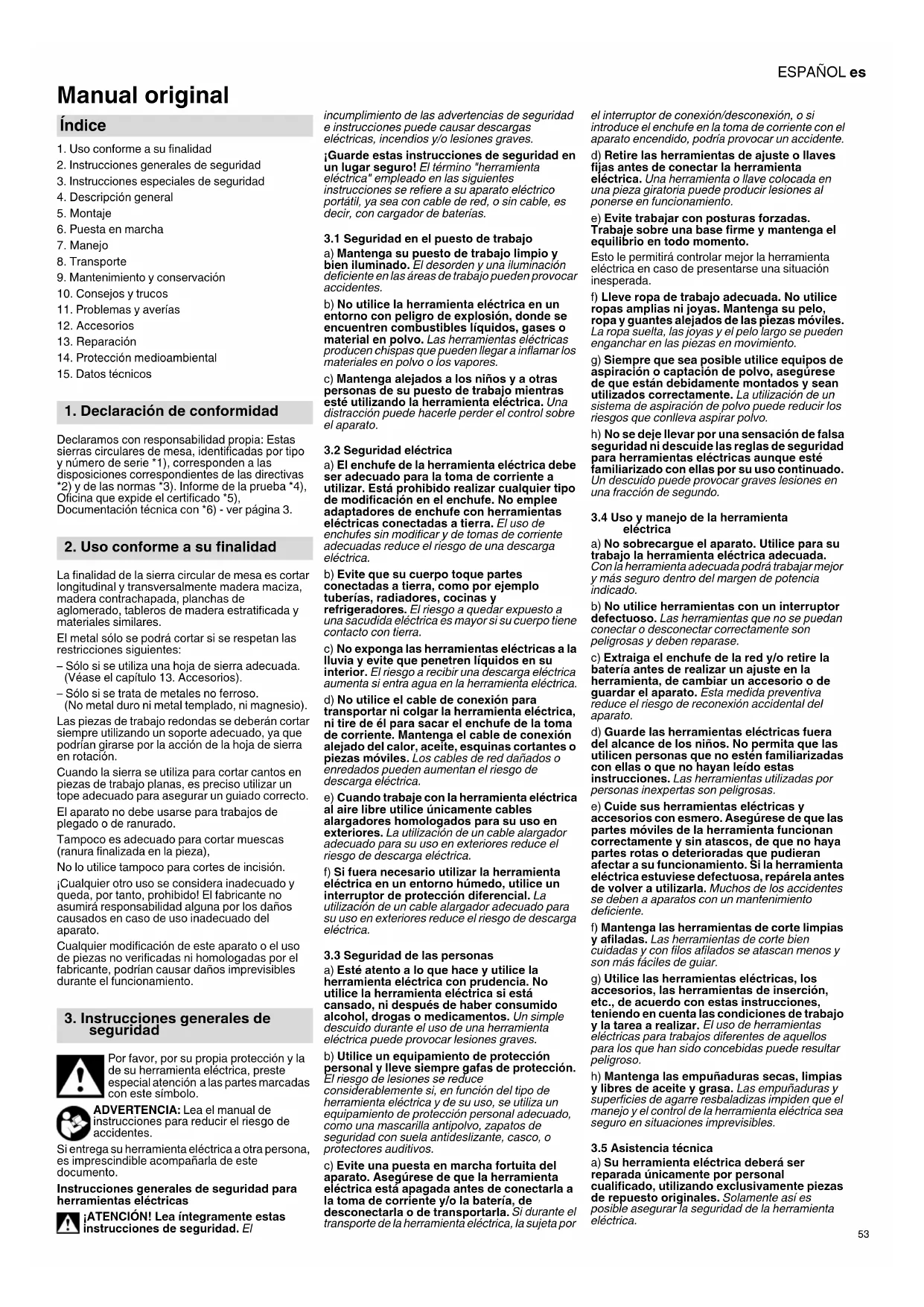 Declaramos con responsabilidad propia: Estas sierras circulares de mesa, identificadas por tipo y número de serie *1), corresponden a las disposiciones correspondientes de las directivas *2) y de las normas *3). Informe de la prueba *4), Oficina que expide el certificado *5), Documentación técnica con *6) - ver página 3. La finalidad de la sierra circular de mesa es cortar longitudinal y transversalmente madera maciza, madera contrachapada, planchas de aglomerado, tableros de madera estratificada y materiales similares. El metal sólo se podrá cortar si se respetan las restricciones siguientes: – Sólo si se utiliza una hoja de sierra adecuada. (Véase el capítulo 13. Accesorios). – Sólo si se trata de metales no ferroso. (No metal duro ni metal templado, ni magnesio). Las piezas de trabajo redondas se deberán cortar siempre utilizando un soporte adecuado, ya que podrían girarse por la acción de la hoja de sierra en rotación. Cuando la sierra se utiliza para cortar cantos en piezas de trabajo planas, es preciso utilizar un tope adecuado para asegurar un guiado correcto. El aparato no debe usarse para trabajos de plegado o de ranurado. Tampoco es adecuado para cortar muescas (ranura finalizada en la pieza), No lo utilice tampoco para cortes de incisión. ¡Cualquier otro uso se considera inadecuado y queda, por tanto, prohibido! El fabricante no asumirá responsabilidad alguna por los daños causados en caso de uso inadecuado del aparato. Cualquier modificación de este aparato o el uso de piezas no verificadas ni homologadas por el fabricante, podrían causar daños imprevisibles durante el funcionamiento. Por favor, por su propia protección y la de su herramienta eléctrica, preste especial atención a las partes marcadas con este símbolo. ADVERTENCIA: Lea el manual de instrucciones para reducir el riesgo de accidentes. Si entrega su herramienta eléctrica a otra persona, es imprescindible acompañarla de este documento. Instrucciones generales de seguridad para herramientas eléctricas ¡ATENCIÓN! Lea íntegramente estas instrucciones de seguridad. El incumplimiento de las advertencias de seguridad e instrucciones puede causar descargas eléctricas, incendios y/o lesiones graves. ¡Guarde estas instrucciones de seguridad en un lugar seguro! El término "herramienta eléctrica" empleado en las siguientes instrucciones se refiere a su aparato eléctrico portátil, ya sea con cable de red, o sin cable, es decir, con cargador de baterías.