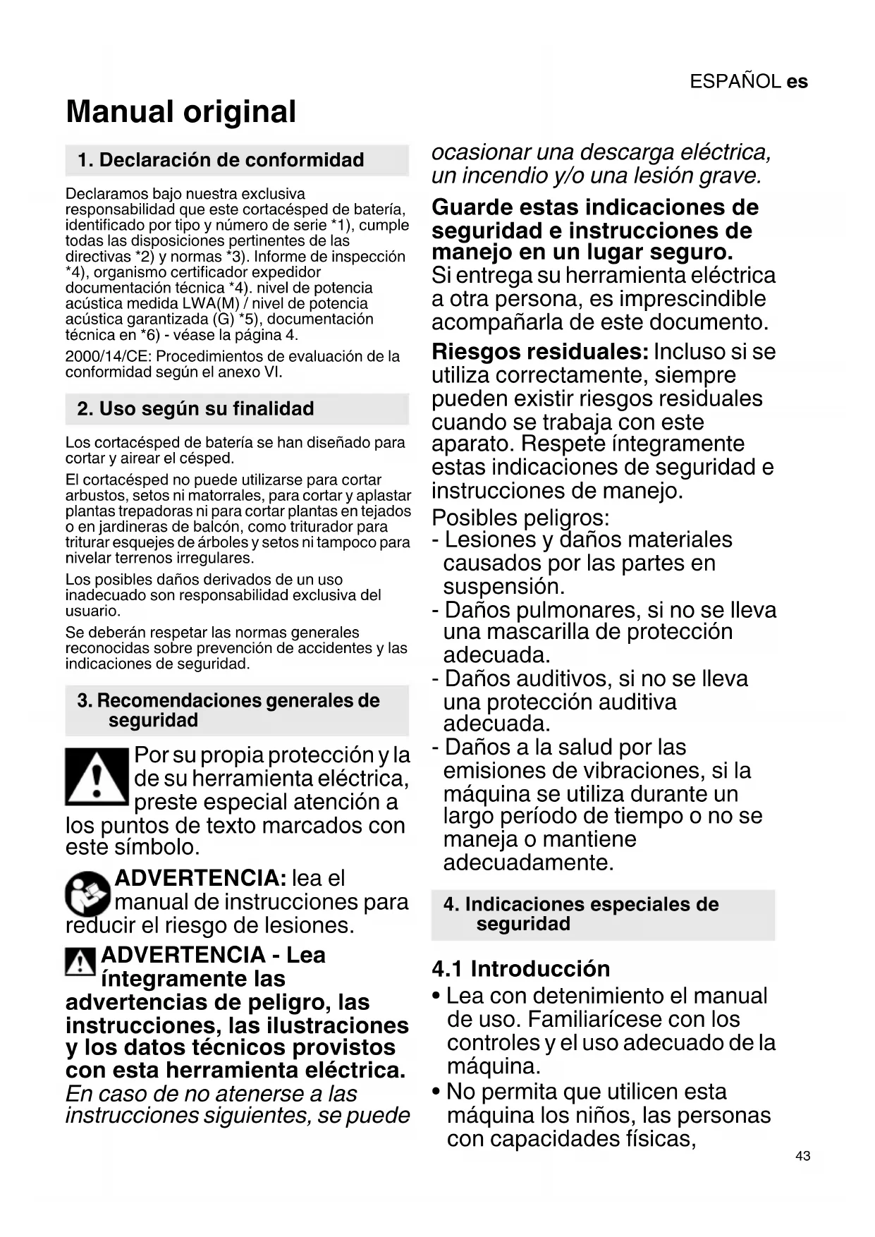 Manual original Declaramos bajo nuestra exclusiva responsabilidad que este cortacésped de batería, identificado por tipo y número de serie *1), cumple todas las disposiciones pertinentes de las directivas *2) y normas *3). Informe de inspección *4), organismo certificador expedidor documentación técnica *4). nivel de potencia acústica medida LWA(M) / nivel de potencia acústica garantizada (G) *5), documentación técnica en *6) - véase la página 4. 2000/14/CE: Procedimientos de evaluación de la conformidad según el anexo VI. Los cortacésped de batería se han diseñado para cortar y airear el césped. El cortacésped no puede utilizarse para cortar arbustos, setos ni matorrales, para cortar y aplastar plantas trepadoras ni para cortar plantas en tejados o en jardineras de balcón, como triturador para triturar esquejes de árboles y setos ni tampoco para nivelar terrenos irregulares. Los posibles daños derivados de un uso inadecuado son responsabilidad exclusiva del usuario. Se deberán respetar las normas generales reconocidas sobre prevención de accidentes y las indicaciones de seguridad. Por su propia protección y la de su herramienta eléctrica, preste especial atención a los puntos de texto marcados con este símbolo. ADVERTENCIA: lea el manual de instrucciones para reducir el riesgo de lesiones. ADVERTENCIA - Lea íntegramente las advertencias de peligro, las instrucciones, las ilustraciones y los datos técnicos provistos con esta herramienta eléctrica. En caso de no atenerse a las instrucciones siguientes, se puede ocasionar una descarga eléctrica, un incendio y/o una lesión grave. Guarde estas indicaciones de seguridad e instrucciones de manejo en un lugar seguro. Si entrega su herramienta eléctrica a otra persona, es imprescindible acompañarla de este documento. Riesgos residuales: Incluso si se utiliza correctamente, siempre pueden existir riesgos residuales cuando se trabaja con este aparato. Respete íntegramente estas indicaciones de seguridad e instrucciones de manejo. Posibles peligros: - Lesiones y daños materiales causados por las partes en suspensión. - Daños pulmonares, si no se lleva una mascarilla de protección adecuada. - Daños auditivos, si no se lleva una protección auditiva adecuada. - Daños a la salud por las emisiones de vibraciones, si la máquina se utiliza durante un largo período de tiempo o no se maneja o mantiene adecuadamente.