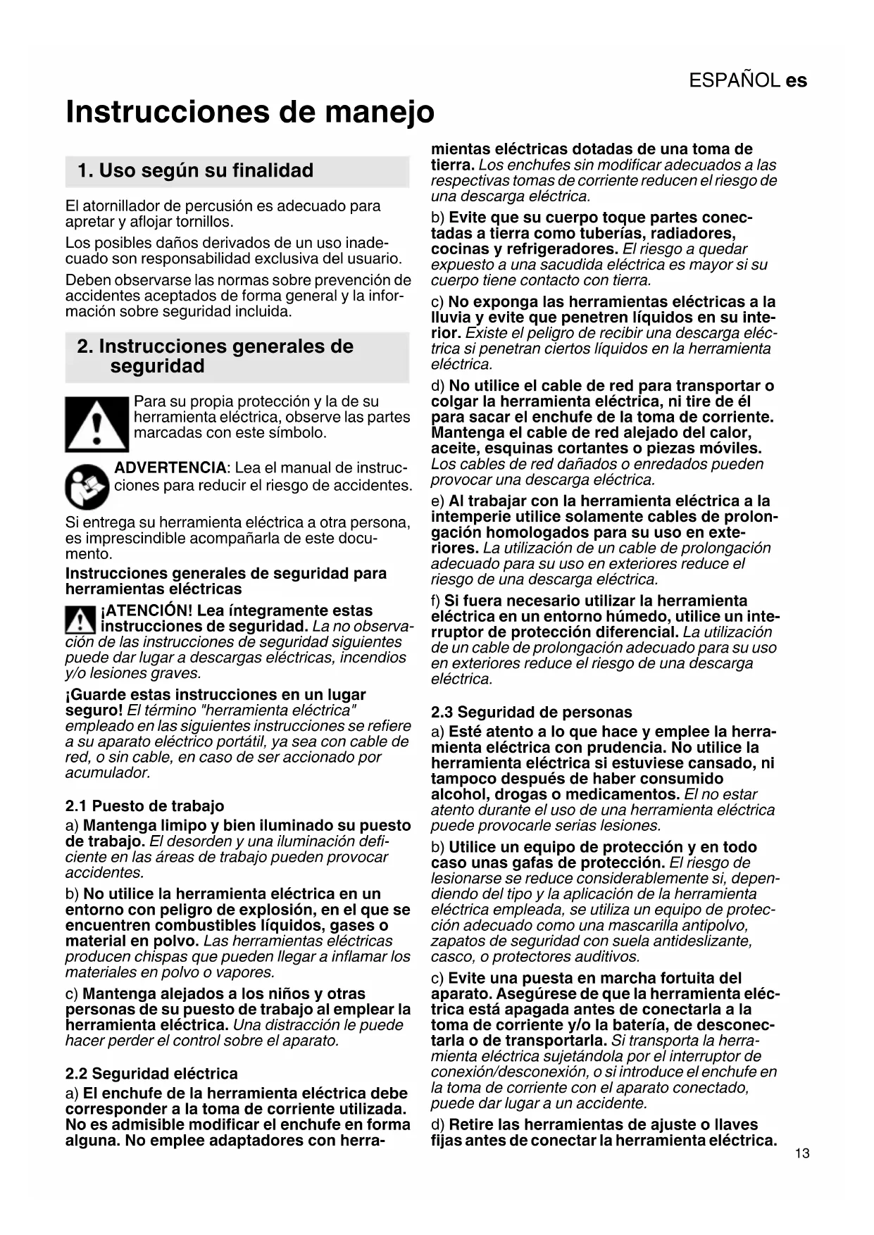 Instrucciones de manejo El atornillador de percusión es adecuado para apretar y aflojar tornillos. Los posibles daños derivados de un uso inade- cuado son responsabilidad exclusiva del usuario. Deben observarse las normas sobre prevención de accidentes aceptados de forma general y la infor- mación sobre seguridad incluida. Para su propia protección y la de su herramienta eléctrica, observe las partes marcadas con este símbolo. ADVERTENCIA: Lea el manual de instruc- ciones para reducir el riesgo de accidentes. Si entrega su herramienta eléctrica a otra persona, es imprescindible acompañarla de este docu- mento. Instrucciones generales de seguridad para herramientas eléctricas ¡ATENCIÓN! Lea íntegramente estas instrucciones de seguridad. La no observa- ción de las instrucciones de seguridad siguientes puede dar lugar a descargas eléctricas, incendios y/o lesiones graves. ¡Guarde estas instrucciones en un lugar seguro! El término "herramienta eléctrica" empleado en las siguientes instrucciones se refiere a su aparato eléctrico portátil, ya sea con cable de red, o sin cable, en caso de ser accionado por acumulador.