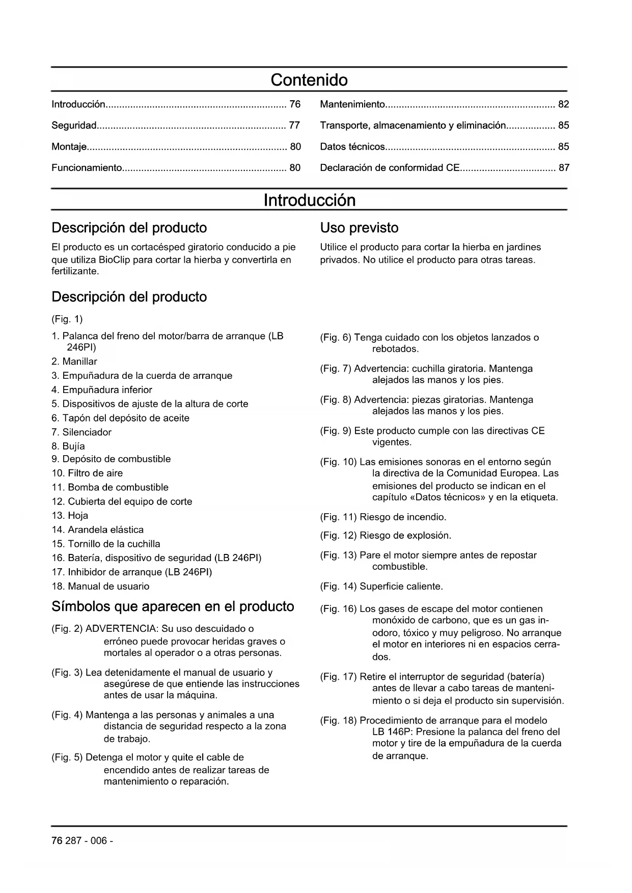 Símbolos que aparecen en el producto (Fig. 2) ADVERTENCIA: Su uso descuidado o erróneo puede provocar heridas graves o mortales al operador o a otras personas. (Fig. 3) Lea detenidamente el manual de usuario y asegúrese de que entiende las instrucciones antes de usar la máquina. (Fig. 4) Mantenga a las personas y animales a una distancia de seguridad respecto a la zona de trabajo. (Fig. 5) Detenga el motor y quite el cable de encendido antes de realizar tareas de mantenimiento o reparación. (Fig. 6) Tenga cuidado con los objetos lanzados o rebotados. (Fig. 7) Advertencia: cuchilla giratoria. Mantenga alejados las manos y los pies. (Fig. 8) Advertencia: piezas giratorias. Mantenga alejados las manos y los pies. (Fig. 9) Este producto cumple con las directivas CE vigentes. (Fig. 10) Las emisiones sonoras en el entorno según la directiva de la Comunidad Europea. Las emisiones del producto se indican en el capítulo «Datos técnicos» y en la etiqueta. (Fig. 11) Riesgo de incendio. (Fig. 12) Riesgo de explosión. (Fig. 13) Pare el motor siempre antes de repostar combustible. (Fig. 14) Superficie caliente. (Fig. 16) Los gases de escape del motor contienen monóxido de carbono, que es un gas in- odoro, tóxico y muy peligroso. No arranque el motor en interiores ni en espacios cerra- dos. (Fig. 17) Retire el interruptor de seguridad (batería) antes de llevar a cabo tareas de manteni- miento o si deja el producto sin supervisión. (Fig. 18) Procedimiento de arranque para el modelo LB 146P: Presione la palanca del freno del motor y tire de la empuñadura de la cuerda de arranque. 76 287 - 006 -(Fig. 19) Procedimiento de arranque para el modelo LB 246PI: Suelte el inhibidor de arranque y presione la barra de arranque. (Fig. 15) Código escaneable. Nota: Los demás símbolos/etiquetas que aparecen en el producto corresponden a requisitos de homologación específicos en otras zonas comerciales. Emisiones Euro V ADVERTENCIA: La manipulación del motor anula la homologación de la UE de este producto. Responsabilidad sobre el producto Como se estipula en las leyes de responsabilidad del producto, no nos hacemos responsables de los daños y perjuicios causados por nuestro producto si: