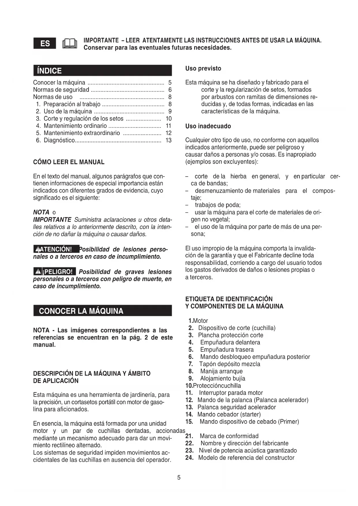 IMPORTANTE – LEER ATENTAMENTE LAS INSTRUCCIONES ANTES DE USAR LA MÁQUINA. Conservar para las eventuales futuras necesidades. Uso previsto Esta máquina se ha diseñado y fabricado para el corte y la regularización de setos, formados por arbustos con ramitas de dimensiones re- ducidas y, de todas formas, indicadas en las características de la máquina. Uso inadecuado Cualquier otro tipo de uso, no conforme con aquellos indicados anteriormente, puede ser peligroso y causar daños a personas y/o cosas. Es inapropiado (ejemplos son excluyentes): – corte de la hierba en general, y en particular cer- ca de bandas; – desmenuzamiento de materiales para el compos- taje; – trabajos de poda; – usar la máquina para el corte de materiales de ori- gen no vegetal; – el uso de la máquina por parte de más de una per- sona; El uso impropio de la máquina comporta la invalida- ción de la garantía y que el Fabricante decline toda responsabilidad, corriendo a cargo del usuario todos los gastos derivados de daños o lesiones propias o a terceros.