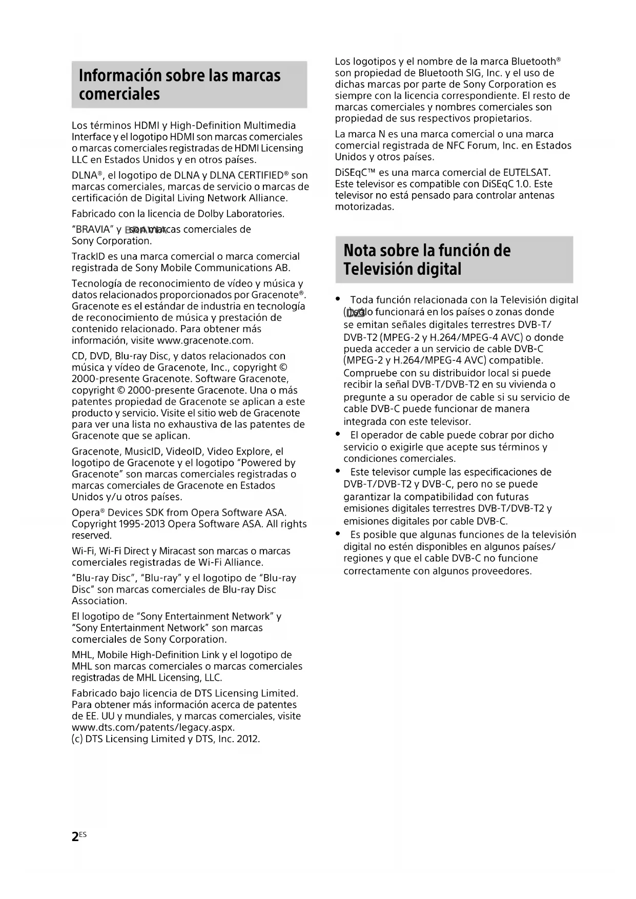 Los términos HDMI y High-Definition Multimedia Interface y el logotipo HDMI son marcas comerciales o marcas comerciales registradas de HDMI Licensing LLC en Estados Unidos y en otros países. DLNA®, el logotipo de DLNA y DLNA CERTIFIED® son marcas comerciales, marcas de servicio o marcas de certificación de Digital Living Network Alliance. Fabricado con la licencia de Dolby Laboratories. “BRAVIA” y son marcas comerciales de Sony Corporation. TrackID es una marca comercial o marca comercial registrada de Sony Mobile Communications AB. Tecnología de reconocimiento de vídeo y música y datos relacionados proporcionados por Gracenote®. Gracenote es el estándar de industria en tecnología de reconocimiento de música y prestación de contenido relacionado. Para obtener más información, visite www.gracenote.com. CD, DVD, Blu-ray Disc, y datos relacionados con música y vídeo de Gracenote, Inc., copyright © 2000-presente Gracenote. Software Gracenote, copyright © 2000-presente Gracenote. Una o más patentes propiedad de Gracenote se aplican a este producto y servicio. Visite el sitio web de Gracenote para ver una lista no exhaustiva de las patentes de Gracenote que se aplican. Gracenote, MusicID, VideoID, Video Explore, el logotipo de Gracenote y el logotipo “Powered by Gracenote” son marcas comerciales registradas o marcas comerciales de Gracenote en Estados Unidos y/u otros países. Opera® Devices SDK from Opera Software ASA. Copyright 1995-2013 Opera Software ASA. All rights reserved. Wi-Fi, Wi-Fi Direct y Miracast son marcas o marcas comerciales registradas de Wi-Fi Alliance. “Blu-ray Disc”, “Blu-ray” y el logotipo de “Blu-ray Disc” son marcas comerciales de Blu-ray Disc Association. El logotipo de “Sony Entertainment Network” y “Sony Entertainment Network” son marcas comerciales de Sony Corporation. MHL, Mobile High-Definition Link y el logotipo de MHL son marcas comerciales o marcas comerciales registradas de MHL Licensing, LLC. Fabricado bajo licencia de DTS Licensing Limited. Para obtener más información acerca de patentes de EE. UU y mundiales, y marcas comerciales, visite www.dts.com/patents/legacy.aspx. (c) DTS Licensing Limited y DTS, Inc. 2012. Los logotipos y el nombre de la marca Bluetooth® son propiedad de Bluetooth SIG, Inc. y el uso de dichas marcas por parte de Sony Corporation es siempre con la licencia correspondiente. El resto de marcas comerciales y nombres comerciales son propiedad de sus respectivos propietarios. La marca N es una marca comercial o una marca comercial registrada de NFC Forum, Inc. en Estados Unidos y otros países. DiSEqC™ es una marca comercial de EUTELSAT. Este televisor es compatible con DiSEqC 1.0. Este televisor no está pensado para controlar antenas motorizadas. Toda función relacionada con la Televisión digital ( ) sólo funcionará en los países o zonas donde se emitan señales digitales terrestres DVB-T/ DVB-T2 (MPEG-2 y H.264/MPEG-4 AVC) o donde pueda acceder a un servicio de cable DVB-C (MPEG-2 y H.264/MPEG-4 AVC) compatible. Compruebe con su distribuidor local si puede recibir la señal DVB-T/DVB-T2 en su vivienda o pregunte a su operador de cable si su servicio de cable DVB-C puede funcionar de manera integrada con este televisor. El operador de cable puede cobrar por dicho servicio o exigirle que acepte sus términos y condiciones comerciales. Este televisor cumple las especificaciones de DVB-T/DVB-T2 y DVB-C, pero no se puede garantizar la compatibilidad con futuras emisiones digitales terrestres DVB-T/DVB-T2 y emisiones digitales por cable DVB-C. Es posible que algunas funciones de la televisión digital no estén disponibles en algunos países/ regiones y que el cable DVB-C no funcione correctamente con algunos proveedores. Información sobre las marcas comerciales Nota sobre la función de Televisión digital3